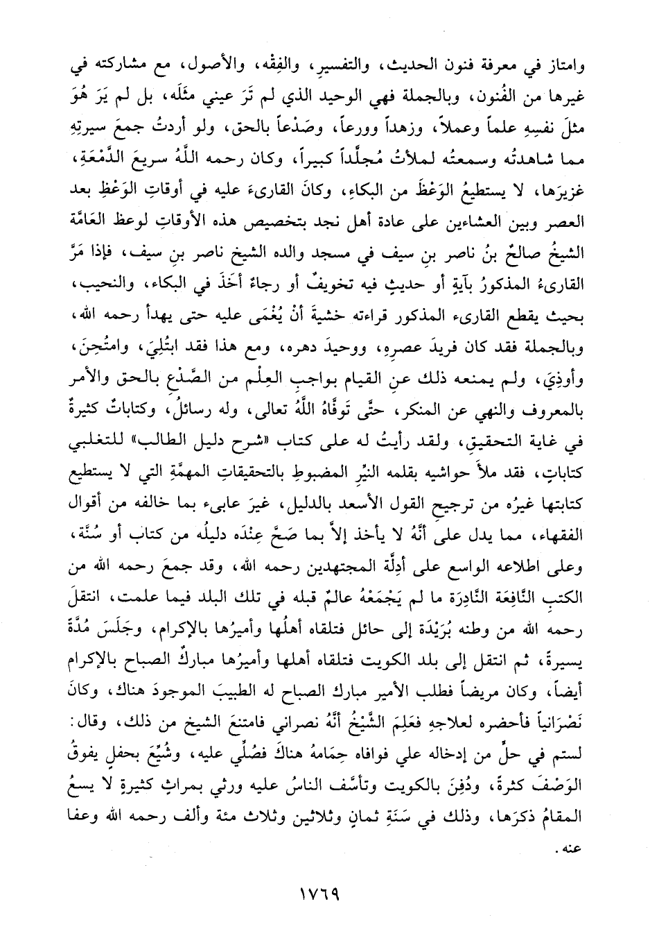 وامتاز في معرفة فنون الحديث، والتفسيرِ، والفِقْه، والأصول، مع مشاركته في غيرها من الفُنون، وبالجملة فهي الوحيد الذي لم تَرَ عيني مثَلَه، بل لم يَرَ هُوَ مثلَ نفسِهِ علمًا وعملًا، وزهدًا وورعًا، وصَدْعًا بالحق، ولو أردتُ جمعَ سيرتِهِ مما شاهدتُه وسمعتُه لملأتُ مُجلَّدًا كبيرًا، وكان رحمه اللهُ سريعَ الدَّمْعَةِ، غزيرَها، لا يستطيعُ الوَعْظَ من البكاءِ، وكانَ القارئَ عليه في أوقاتِ الوَعْظِ بعد العصر وبين العشاءين على عادة أهل نجد بتخصيص هذه الأوقاتِ لوعظ العَامَّة الشيخُ صالحٌ بنُ ناصر بنِ سيف في مسجد والده الشيخ ناصر بنِ سيف، فإذا مَرَّ القارئُ المذكورُ بآيةٍ أو حديثٍ فيه تخويفٌ أو رجاءٌ أخَذَ في البكاء، والنحيب، بحيث يقطع القارئ المذكور قراءته خشيةَ أنْ يُغْمَى عليه حتى يهدأ رحمه الله، وبالجملة فقد كان فريدَ عصرِهِ، ووحيدَ دهره، ومع هذا فقد ابتُلِيَ، وامتُحِنَ، وأوذِيَ، ولم يمنعه ذلك عنِ القيام بواجبِ العِلْم من الصَّدْعِ بالحق والأمر بالمعروف والنهي عن المنكر، حتَّى تَوفَّاهُ اللهُ تعالى، وله رسائلُ، وكتاباتٌ كثيرةٌ في غاية التحقيقِ، ولقد رأيتُ له على كتاب "شرح دليل الطالب" للتغلبي كتاباتٍ، فقد ملأَ حواشيه بقلمه النيِّرِ المضبوطِ بالتحقيقاتِ المهمَّةِ التي لا يستطيع كتابتها غيرُه من ترجيحِ القول الأسعد بالدليل، غيرَ عابئ بما خالفه من أقوال الفقهاء، مما يدل على أنَّهُ لا يأخذ إلَّا بما صَحَّ عِنْدَه دليلُه من كتاب أو سُنَّة، وعلى اطلاعه الواسع على أدِلَّة المجتهدين رحمه الله، وقد جمعَ رحمه الله من الكتبِ النَّافِعَة النَّادِرَة ما لم يَجْمَعْهُ عالمٌ قبله في تلك البلد فيما علمت، انتقلَ رحمه الله من وطنه بُرَيْدَة إلى حائل فتلقاه أهلُها وأميرُها بالإكرام، وجَلَسَ مُدَّةً يسيرةً، ثم انتقل إلى بلد الكويت فتلقاه أهلها وأميرُها مباركٌ الصباح بالإكرام أيضًا، وكان مريضًا فطلب الأمير مبارك الصباح له الطبيبَ الموجودَ هناك، وكانَ نَصْرَانيًا فأحضره لعلاجهِ فعَلِمَ الشَّيْخُ أنَّهُ نصراني فامتنعَ الشيخ من ذلك، وقال: لستم في حلًّ من إدخاله علي فوافاه حِمَامهُ هناكَ فصُلَّي عليه، وشُيِّعَ بحفلٍ يفوقُ الوَصْفَ كثرةً، ودُفِنَ بالكويت وتأسَّف الناسُ عليه ورثي بمراثٍ كثيرةٍ لا يسعُ المقامُ ذكرَها، وذلك في سَنَةِ ثمانٍ وثلاثين وثلاث مئة وألف رحمه الله وعفا عنه.