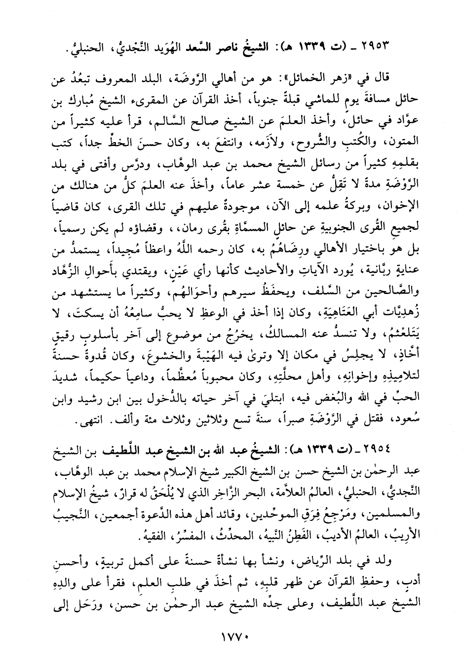2954 - (ت 1339 هـ): الشيخُ عبد الله بن الشيخ عبد اللَّطيف بن الشيخ عبد الرحمن بن الشيخ حسن بن الشيخ الكبير شيخ الإسلام محمد بن عبد الوهَّاب، النَّجديُّ، الحنبليُّ، العالمُ العلَّامة، البحر الزَّاخِر الذي لا يُلْحَقُ له قرارٌ، شيخُ الإسلام والمسلمين، ومَرْجِعُ فِرَقِ الموحِّدين، وقائد أهل هذه الدَّعوة أجمعين، النَّجيبُ الأرِيبُ، العالمُ الأديبُ، الفَطِنُ النَّبيهُ، المحدِّثُ، المفسِّرُ، الفقيهُ.