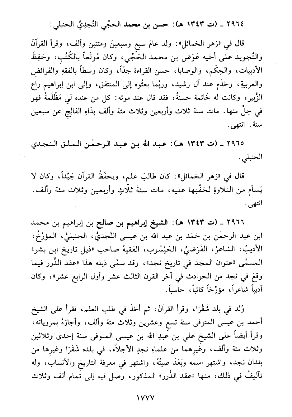 2966 - (ت 1343 هـ): الشيخ إبراهيم بن صالح بن إبراهيم بن محمد ابن عبد الرحمن بن حَمَد بن عبد الله بن عيسى النَّجديُّ، الحنبليُّ، المؤرِّخُ، الأديبُ، الشاعرُ، الفَرَضيُّ، الحَيْسُوب، الفقيهُ صاحب "ذيل تاريخ ابن بشر" المسمَّى "عنوان المجد في تاريخ نجد"، وقد سمَّى ذيله هذا "عقد الدُّرر فيما وقعَ في نجد من الحوادث في آخر القرن الثالث عشر وأول الرابع عشر"، وكان أديبًا شاعرًا، مؤرَّخًا كاتبًا، حاسبًا.