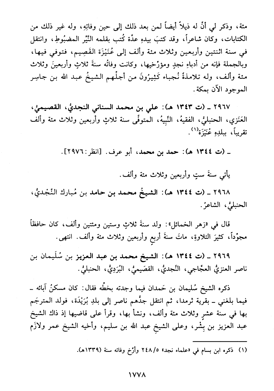 2967 - (ت 1343 هـ): علي بن محمد السناني النجديُّ، القصيميُّ، العَنَزي، الحنبليُّ، الفقيهُ، النَّبِيهُ، المتوفَّى سنة ثلاثٍ وأربعين وثلاث مئة وألف تقريبًا، ببلدِهِ عُنَيْزَة (¬1).