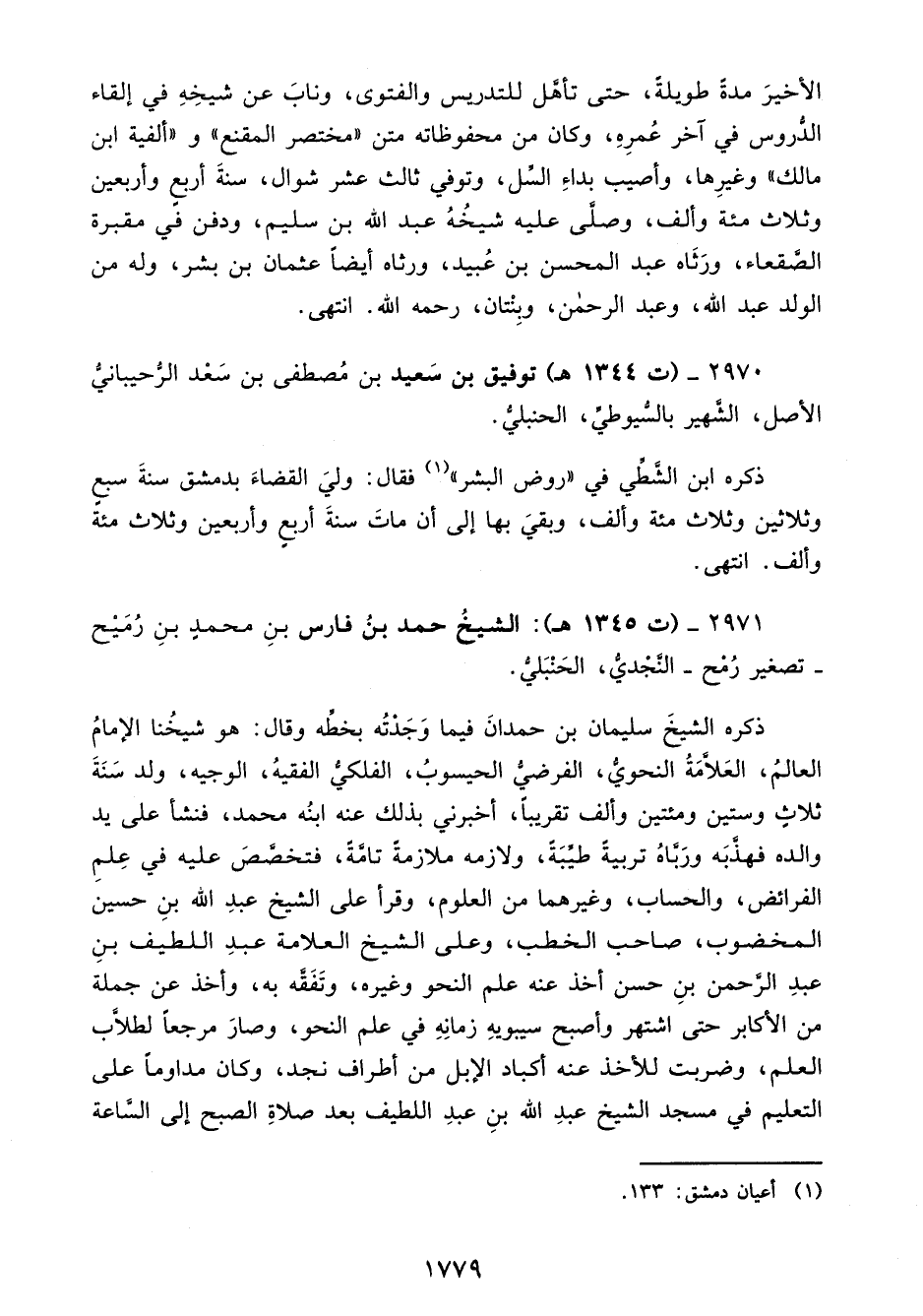 2970 - (ت 1344 هـ): توفيق بن سَعيد بن مُصطفى بن سَعْد الرُّحيبانيُّ الأصل، الشَّهير بالسُّيوطيِّ، الحنبليُّ.