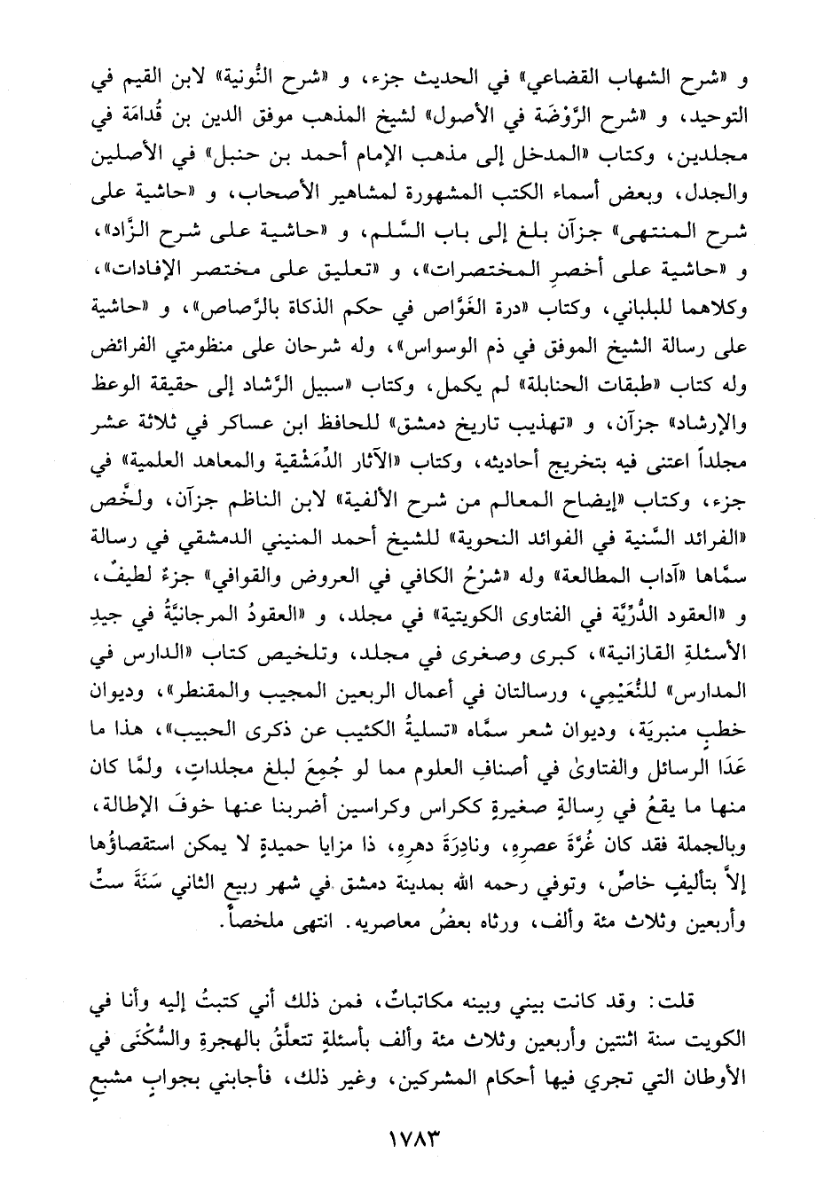 و"شرح الشهاب القضاعي" في الحديث جزء، و"شرح النُّونية" لابن القيم في التوحيد، و"شرح الرَّوْضَة في الأصول" لشيخ المذهب موفق الدين بن قُدامَة في مجلدين، وكتاب "المدخل إلى مذهب الإمام أحمد بن حنبل" في الأصلين والجدل، وبعض أسماء الكتب المشهورة لمشاهير الأصحاب، و"حاشية على شرح المنتهى" جزآن بلغ إلى باب السَّلم، و"حاشية على شرح الزَّاد"، و"حاشية على أخصرِ المختصرات"، و"تعليق على مختصر الإفادات"، وكلاهما للبلباني، وكتاب "درة الغَوَّاص في حكم الذكاة بالرَّصاص"، و"حاشية على رسالة الشيخ الموفق في ذم الوسواس"، وله شرحان على منظومتي الفرائض وله كتاب "طبقات الحنابلة" لم يكمل، وكتاب "سبيل الرَّشاد إلى حقيقة الوعظ والإرشاد" جزآن، و"تهذيب تاريخ دمشق" للحافظ ابن عساكر في ثلاثة عشر مجلدًا اعتنى فيه بتخريج أحاديثه، وكتاب "الآثار الدِّمَشْقية والمعاهد العلمية" في جزء، وكتاب "إيضاح المعالم من شرح الألفية" لابن الناظم جزآن، ولخَّص "الفرائد السَّنية في الفوائد النحوية" للشيخ أحمد المنيني الدمشقي في رسالة سمَّاها "آداب المطالعة" وله "شرْحُ الكافي في العروض والقوافي" جزءٌ لطيفٌ، و"العقود الدُّرِّيَّة في الفتاوى الكويتية" في مجلد، و"العقودُ المرجانيَّةُ في جيدِ الأسئلةِ القازانية"، كبرى وصغرى في مجلد، وتلخيص كتاب "الدارس في المدارس" للنُّعَيْمِي، ورسالتان في أعمال الربعين المجيب والمقنطر"، وديوان خطبٍ منبريَة، وديوان شعر سمَّاه "تسليةُ الكئيب عن ذكرى الحبيب"، هذا ما عَدَا الرسائل والفتاوى في أصنافِ العلوم مما لو جُمِعَ لبلغ مجلداتٍ، ولمَّا كان منها ما يقعُ في رِسالةٍ صغيرةٍ ككراس وكراسين أضربنا عنها خوفَ الإطالة، وبالجملة فقد كان غُرَّةَ عصرِهِ، ونادِرَةَ دهرِهِ، ذا مزايا حميدةٍ لا يمكن استقصاؤُها إلَّا بتأليفٍ خاصٍّ، وتوفي رحمه الله بمدينة دمشق في شهر ربيع الثاني سَنَةَ ستٍّ وأربعين وثلاث مئة وألف، ورثاه بعضُ معاصريه. انتهى ملخصًّا.