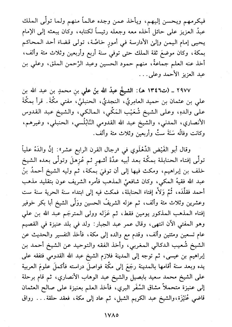 2977 - (ت 1346 هـ): الشيخُ عبدُ الله بنُ علي بنِ محمدٍ بن عبد الله بن علي بن عثمان بن حميد العامِريُّ، النجديُّ، الحنبليُّ، مفتي مكَّةَ. قرأ بمكَّةَ على والدهِ، وعلى الشيخ شُعَيْب المَكِّي، المالكي، والشيخ عبد القدوس الأنصاري، المدني، والشيخ عبد الله القدومي النَّابُلُسي، الحنبلي، وغيرهم، وكانت وفاتُه سَنَةَ ستٍّ وأربعين وثلاث مئة وألف.