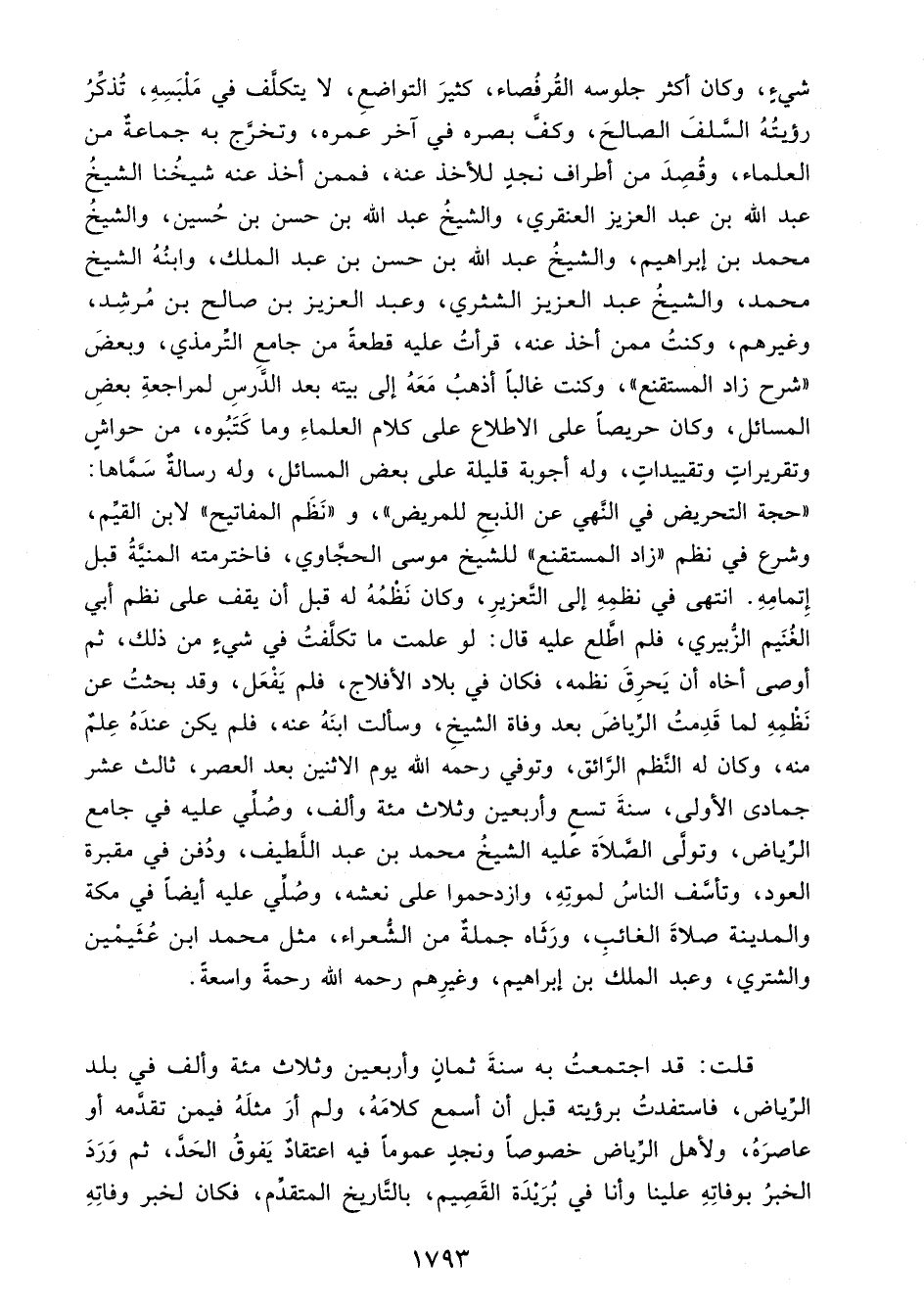 قلت: قد اجتمعتُ به سنةَ ثمانٍ وأربعين وثلاث مئة وألف في بلد الرِّياض، فاستفدتُ برؤيته قبل أن أسمع كلامَهُ، ولم أرَ مثلَهُ فيمن تقدَّمه أو عاصرَهُ، ولأهل الرِّياض خصوصًا ونجدِ عمومًا فيه اعتقادٌ يَفوقُ الحَدَّ، ثم وَرَدَ الخبرُ بوفاتِهِ علينا وأنا في بُرَيْدَة القَصِيم، بالتَّاريخ المتقدِّم، فكان لخبر وفاتِهِ