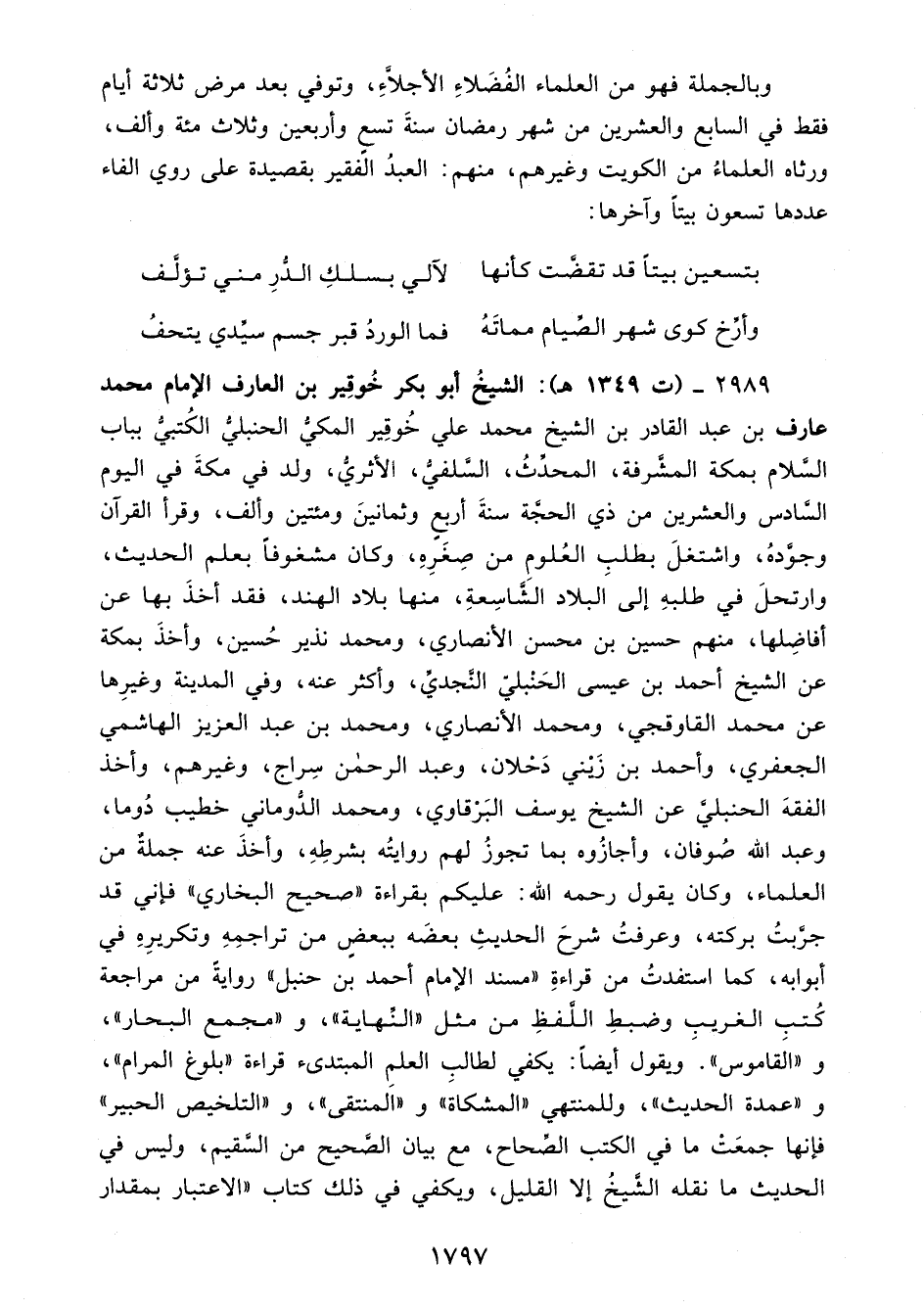 2989 - (ت 1349 هـ): الشَّيخُ أبو بكر خُوقِير بن العارف الإمام محمَّد عارف بن عبد القادر بن الشَّيخ محمَّد علي خُوقِير المكيُّ الحنبليُّ الكُتبيُّ بباب السَّلام بمكة المشَّرفة، المحدِّثُ، السَّلفيُّ، الأثريُّ، ولد في مكةَ في اليوم السَّادس والعشرين من ذي الحجَّة سنةَ أربعٍ وثمانينَ ومئتين وألف، وقرأ القرآن وجوَّدهُ، واشتغلَ بطلبِ العُلومِ من صِغَرِهِ، وكان مشغوفًا بعلم الحديث، وارتحلَ في طلبهِ إلى البلاد الشَّاسِعةِ، منها بلاد الهند، فقد أخذَ بها عن أفاضِلها، منهم حسين بن محسن الأنصاري، ومحمد نذير حُسين، وأخذَ بمكة عن الشَّيخ أحمد بن عيسى الحَنْبليّ النَّجديِّ، وأكثر عنه، وفي المدينة وغيرِها عن محمَّد القاوقجي، ومحمد الأنصاري، ومحمد بن عبد العزيز الهاشمي الجعفري، وأحمد بن زَيْني دَحْلان، وعبد الرحمن سِراج، وغيرهم، وأخذ الفقهَ الحنبليَّ عن الشيخ يوسف البَرْقاوي، ومحمد الدُّوماني خطيب دُوما، وعبد الله صُوفان، وأجازُوه بما تجوزُ لهم روايتُه بشرطِهِ، وأخذَ عنه جملةٌ من العلماء، وكان يقول رحمه الله: عليكم بقراءة "صحيح البُخاريّ" فإني قد جرَّبتُ بركته، وعرفتُ شرحَ الحديثِ بعضَه ببعضٍ من تراجمِهِ وتكريرِهِ في أبوابه، كما استفدتُ من قراءةِ "مسند الإمام أحمد بن حنبل" روايةً من مراجعة كُتبِ الغريبِ وضبطِ اللَّفظِ من مثل "النِّهاية"، و"مجمع البحار"، و"القاموس". ويقول أيضًا: يكفي لطالبِ العلمِ المبتدئ قراءة "بلوغ المرام"، و"عمدة الحديث"، وللمنتهي "المشكاة" و"المنتقى"، و"التلخيص الحبير" فإنَّها جمعَتْ ما في الكتب الصَّحاح، مع بيان الصَّحيح من السَّقيم، وليس في الحديث ما نقله الشَّيخُ إلَّا القليل، ويكفي في ذلك كتاب "الاعتبار بمقدار