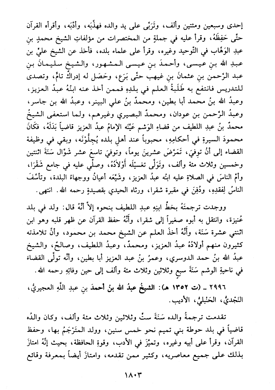 2996 - (ت 1352 هـ): الشَّيخُ عبدُ الله بنُ أحمدَ بنِ عبدِ اللهِ العجيريُّ، النَجْديُّ، الحَنْبليُّ، الأديب.