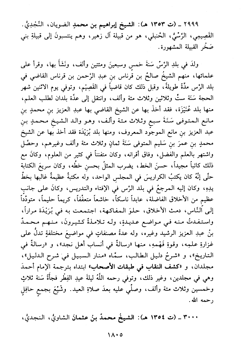 2999 - (ت 1353 هـ): الشَّيخ إبراهيم بن محمدٍ الضويان، النَّجْدِيُّ. القَصِيمِي، الرَّسِّيُّ، الحَّنبلي، هو من قبيلة آل زهير، وهم ينتسبونَ إلى قبيلةِ بني صَخْر القبيلة المشهورة.