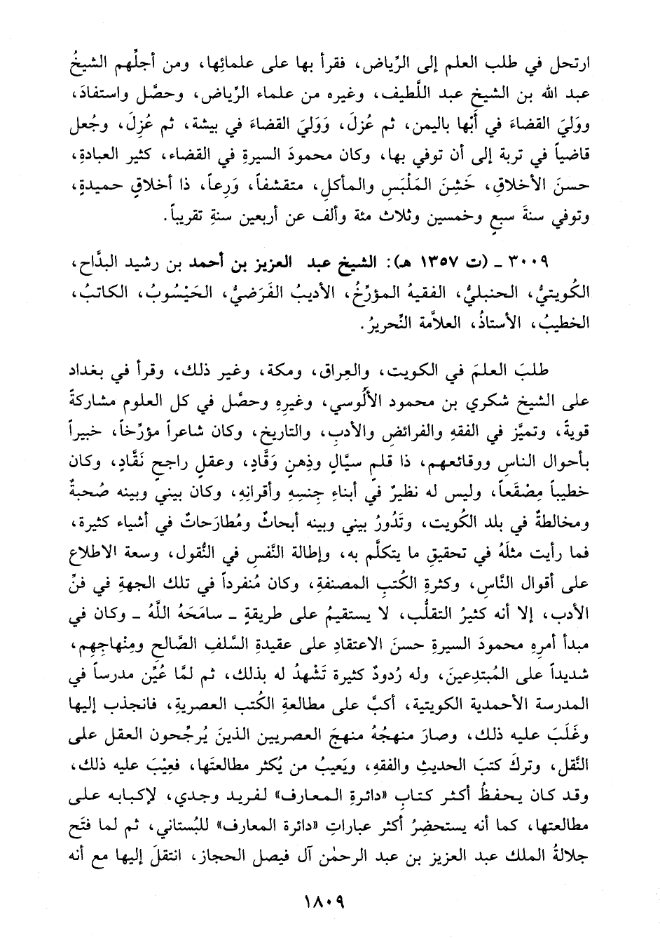 3009 - (ت 1357 هـ): الشَّيخ عبد العزيز بن أحمد بن رشيد البدَّاح، الكُويتيُّ، الحنبليُّ، الفقيهُ المؤرِّخُ، الأديبُ الفَرَضيُّ، الحَيْسُوبُ، الكاتبُ، الخطيبُ، الأستاذُ، العلَّامة النَّحريرُ.
