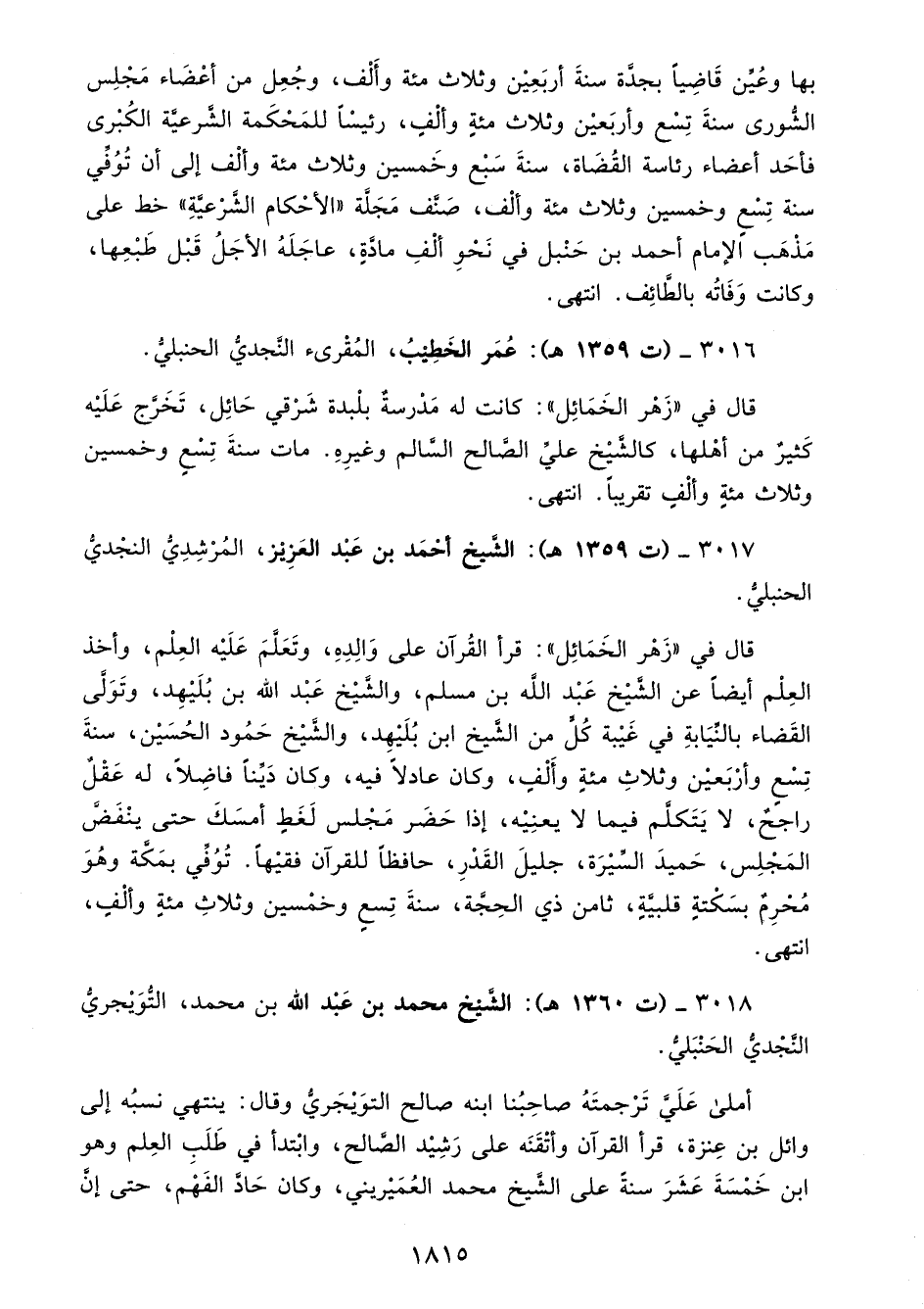3016 - (ت 1359 هـ): عُمَر الخَطِيْبُ، المُقْرئ النَّجديُّ الحنبليُّ.