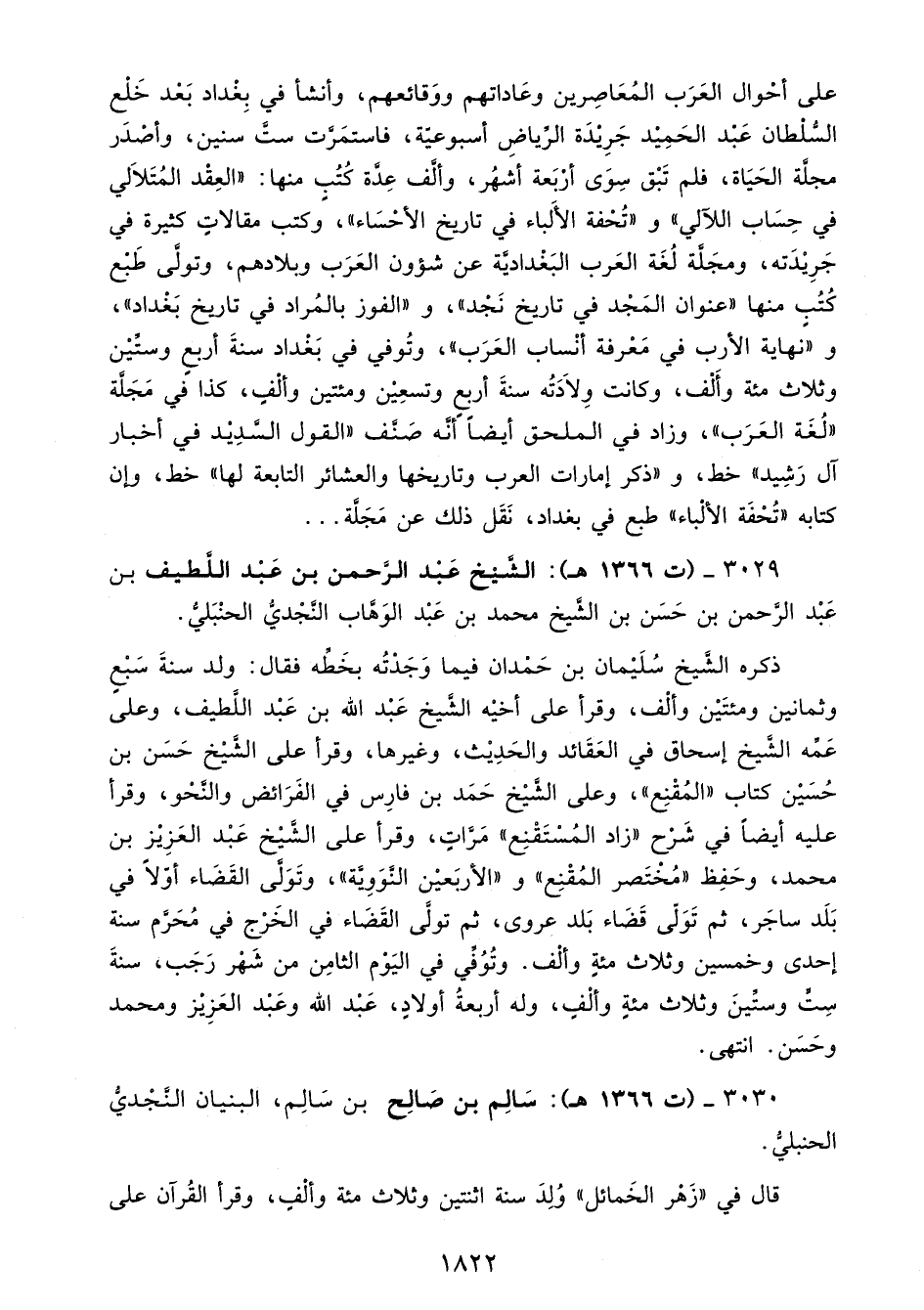 3029 - (ت 1366 هـ): الشَّيخ عَبْد الرَّحمن بن عَبْد اللَّطيف بن عَبْد الرَّحمن بن حَسَن بن الشَّيخ محمَّد بن عَبْد الوَهَّاب النَّجْديُّ الحنْبَليُّ.
