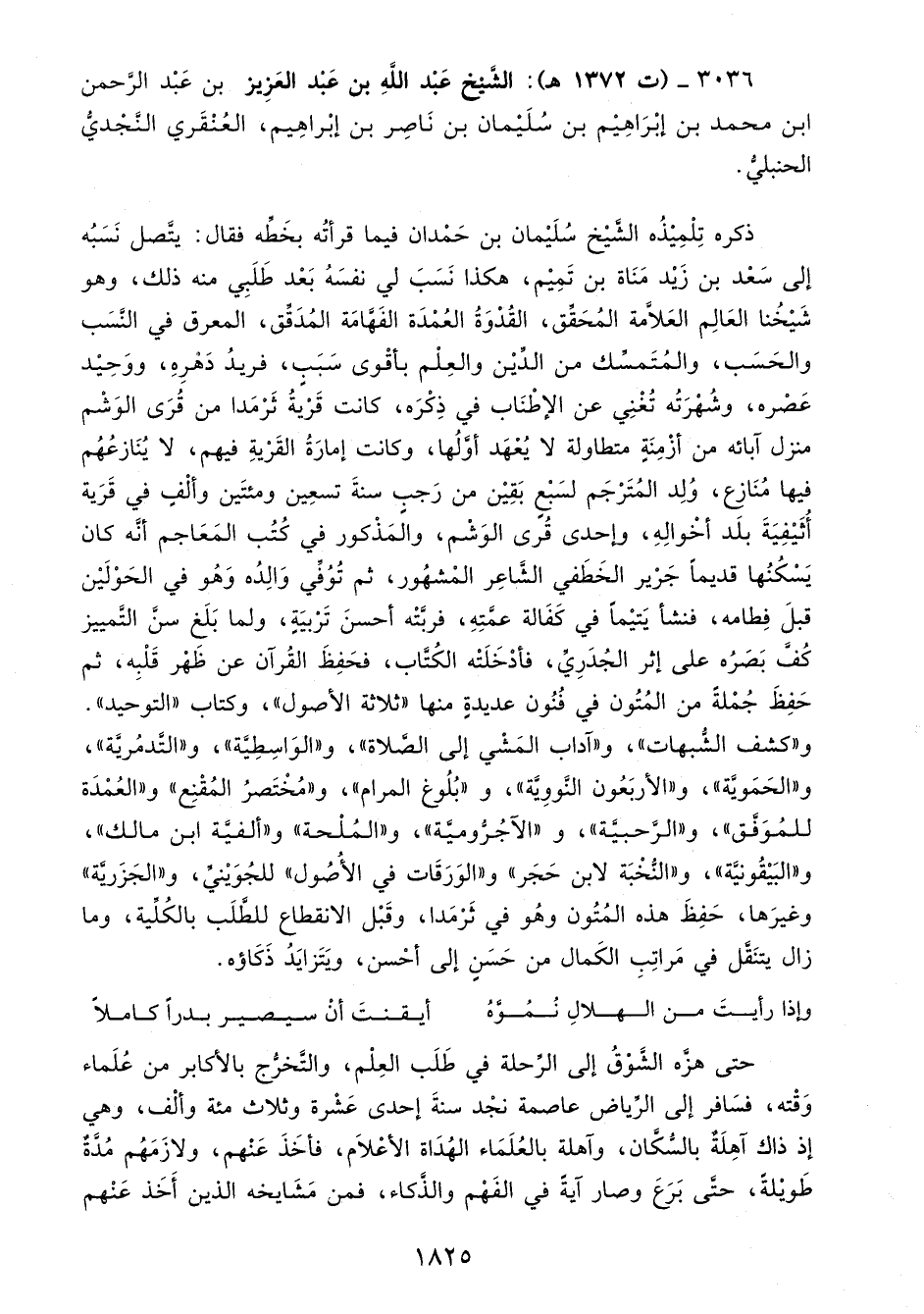 3036 - (ت 1372 هـ): الشَّيخ عَبْد اللهِ بن عَبْد العَزِيز بن عَبْد الرَّحمن ابن محمَّد بن إبْرَاهِيْم بن سُلَيْمان بن نَاصِر بن إبْراهِيم، العُنْقَري النَّجْديُّ الحنبليُّ.