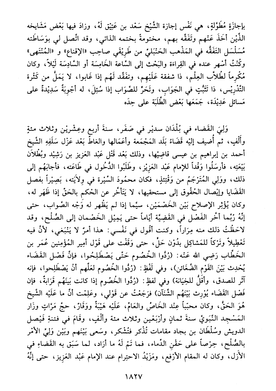 بإجازَةٍ مُطَوَّلةٍ، هي نَفْس إجازة الشَّيْخ سَعْد بن عَتِيْق لَهُ، وزادَ فيها بَعْض مَشَايخه الذَّيْن أخَذَ عَنْهم وتَفَقَّه بهم، مختومةً بختمه الذاتي، وقد اتَّصل لي بوَسَاطَته مُسَلْسَل التَفَقُّه في المَذْهب الحَنْبَليِّ من طَرِيْقَي صاحِب "الإقناع" و"المُنْتَهى" وكُنْتُ أسْهر عنده في القِراءَة والبَحْث إلى السَّاعة الخَامِسَة أو السَّادِسَة لَيْلًا، وكان مُكْرِمًا لطُلَّاب العِلْم، ذا شفقة عَلَيْهِم، وتفَقَّد لَهُم إذا غَابوا، لا يَمَلُّ من كَثْرة التَّدْرِيْس، ذا تَثَبُّتٍ في الجَوَابِ، وتَحَرٍّ للصَّوَاب إذا سُئِلَ، له أجْوِبَةٌ سَدِيْدةٌ على مَسائل عَدِيْدَة، جَمَعَها بَعْض الطَّلَبَة على حِدَه.