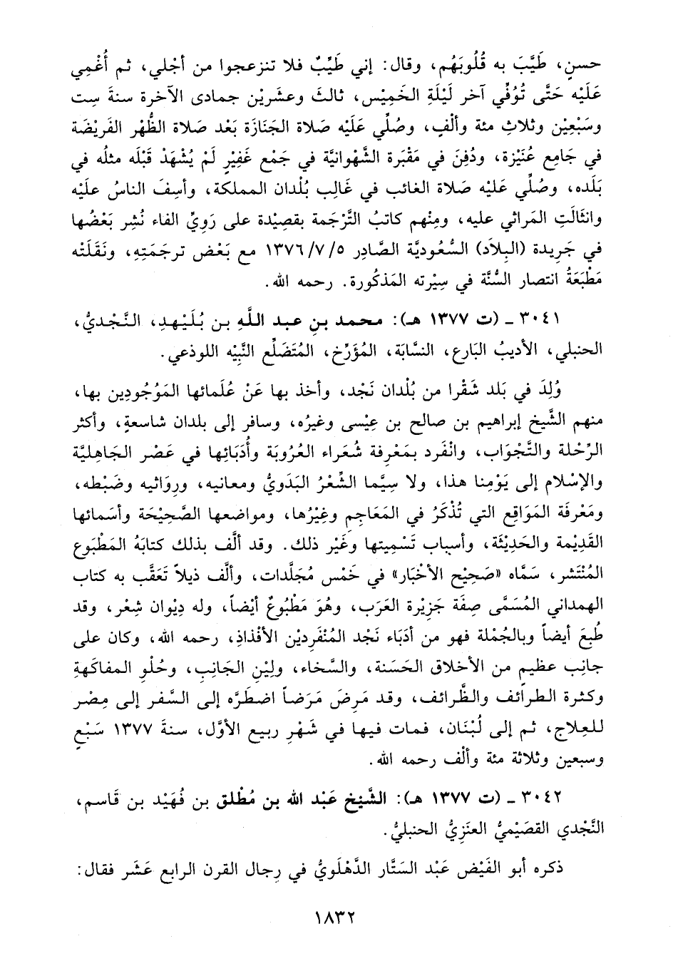 3041 - (ت 1377 هـ): محمَّد بنِ عبد اللهِ بن بُلَيْهدِ، النَّجْديُّ، الحنبليُّ، الأديبُ البَارع، النسَّابَة، المُؤَرِّخ، المُتَضَلِّع النَّبِيْه اللوذعي.