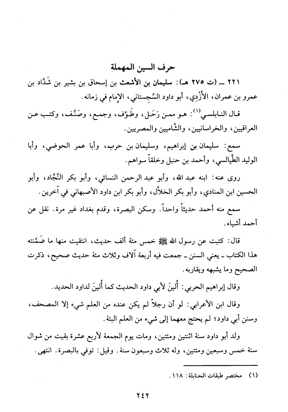 221 - (ت 275 هـ): سليمان بن الأشعث بن إسحاق بن بشير بن شَدَّاد بن عمرو بن عمران، الأَزْدِي، أبو داود السِّجِستاني، الإِمام في زمانه.