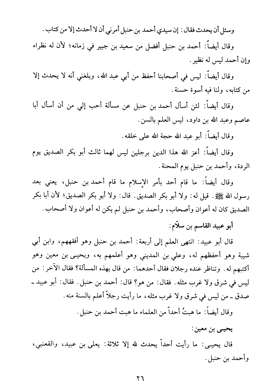 وقال أيضًا: ما قام أحد بأمر الإِسلام ما قام أحمد بن حنبل، يعني بعد رسول الله - صلى الله عليه وسلم -. قيل له: ولا أبو بكر الصديق. قال: ولا أبو بكر الصديق؛ لأن أبا بكر الصديق كان له أعوان وأصحاب، وأحمد بن حنبل لم يكن له أعوان ولا أصحاب.