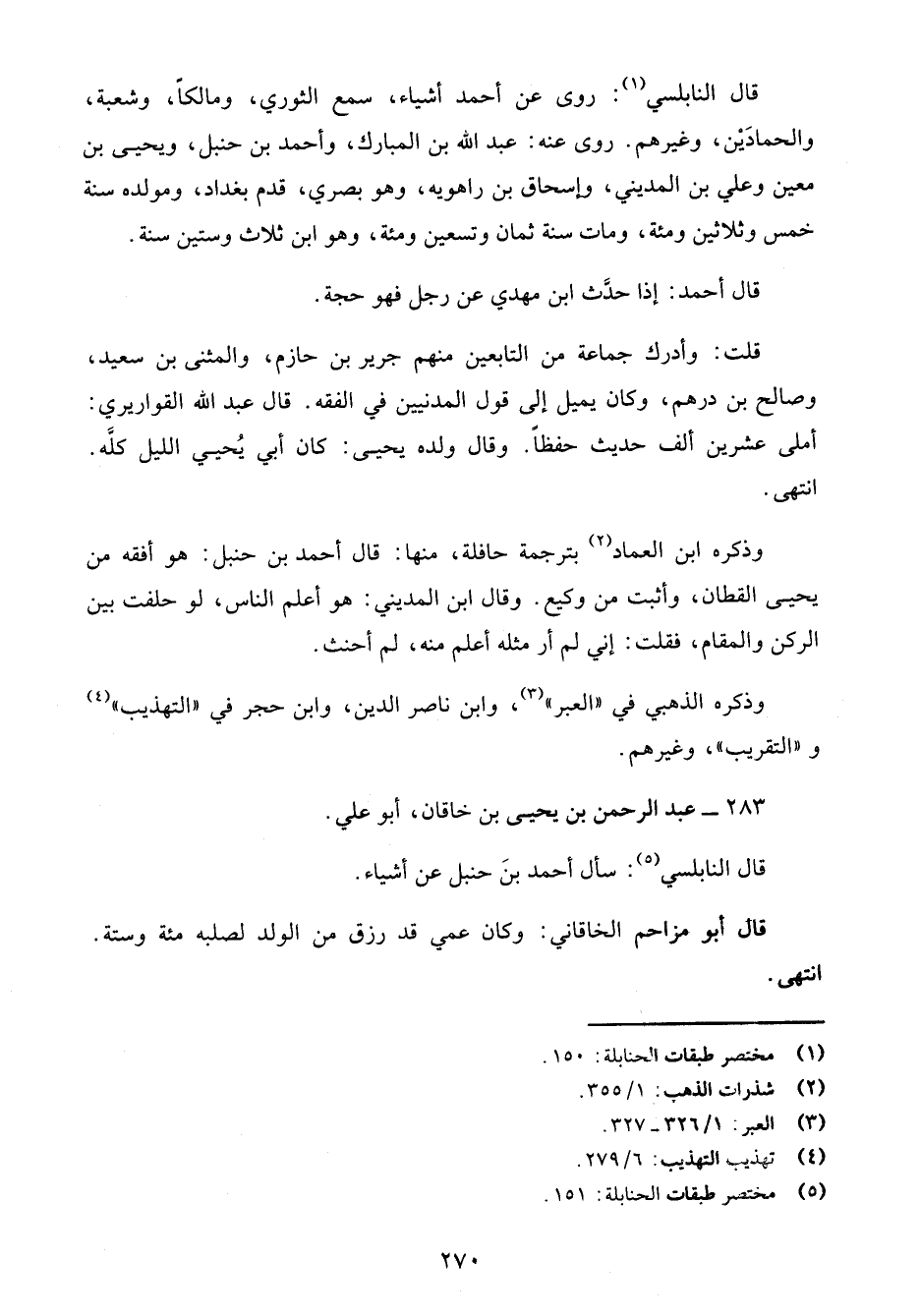 قلت: وأدرك جماعة من التابعين منهم جرير بن حازم، والمثنى بن سعيد، وصالح بن درهم، وكان يميل إلى قول المدنيين في الفقه. قال عبد الله القواريري: أملى عشرين ألف حديث حفظًا. وقال ولده يحيى: كان أبي يُحيي الليل كلَّه. انتهى.