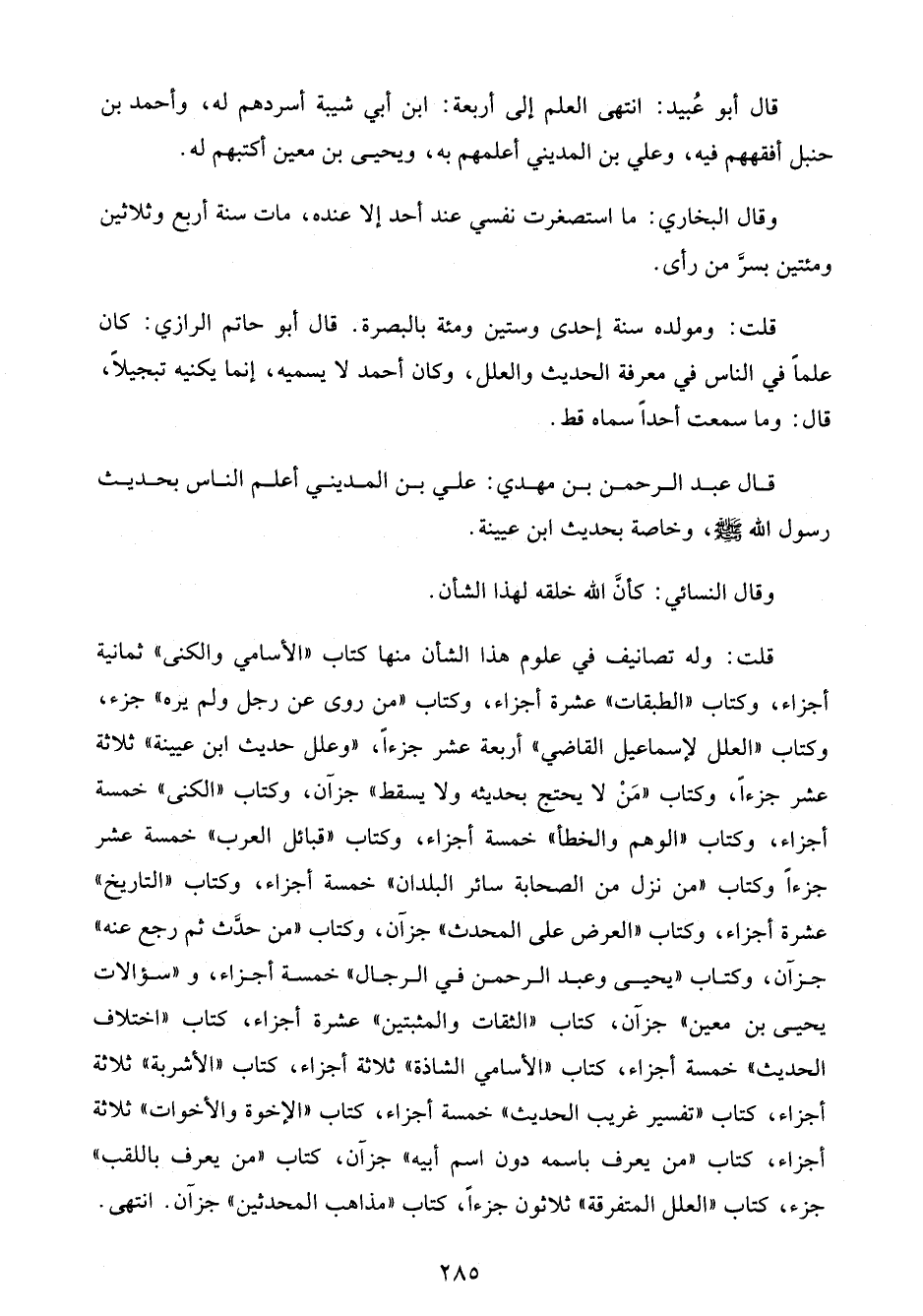 قال أبو عُبيد: انتهى العلم إلى أربعة: ابن أبي شيبة أسردهم له، وأحمد بن حنبل أفقههم فيه، وعلي بن المديني أعلمهم به، ويحيى بن معين أكتبهم له.