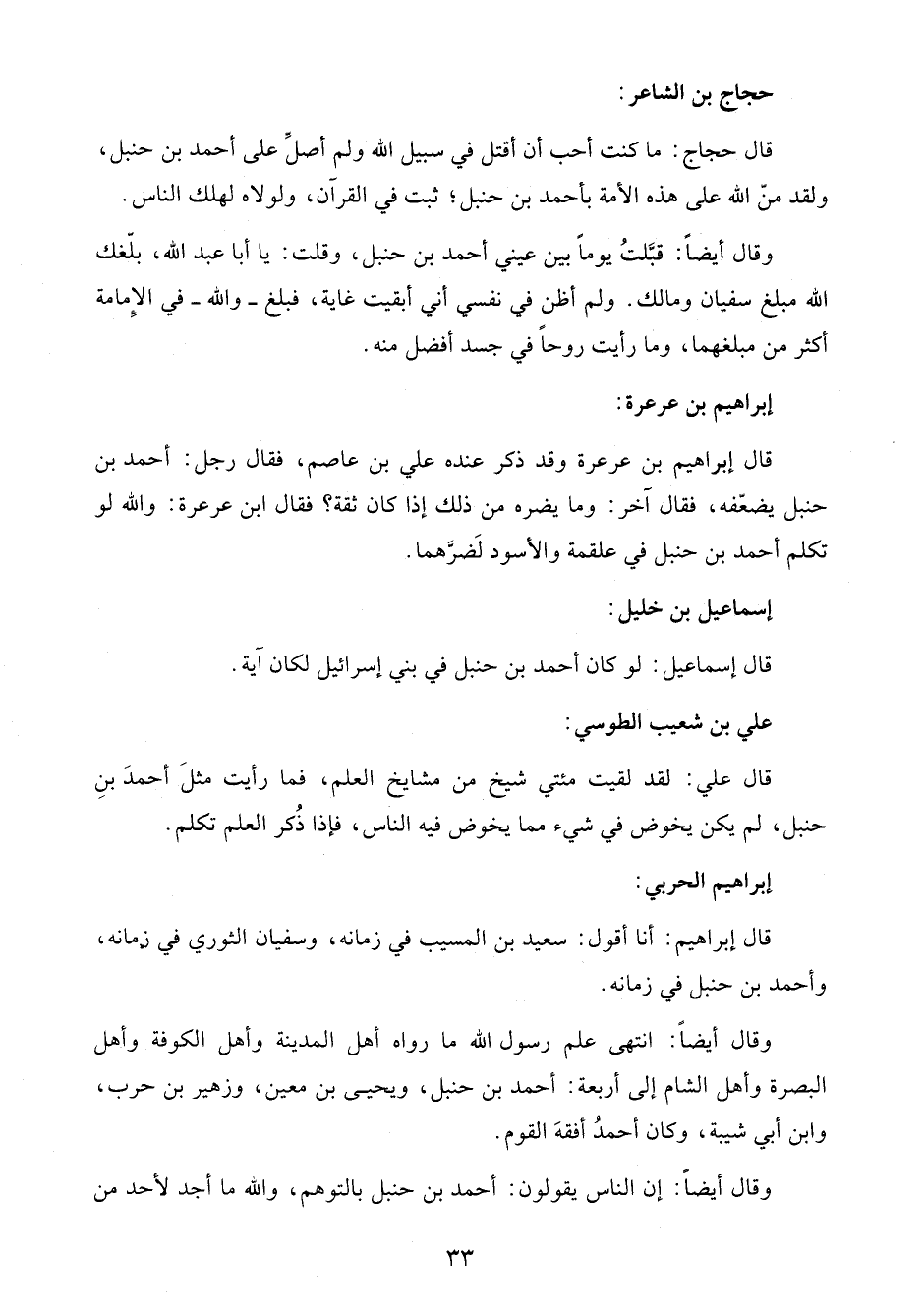 قال حجاج: ما كنت أحب أن أقتل في سبيل الله ولم أصلِّ على أحمد بن حنبل، ولقد منّ الله على هذه الأمة بأحمد بن حنبل؛ ثبت في القرآن، ولولاه لهلك الناس.