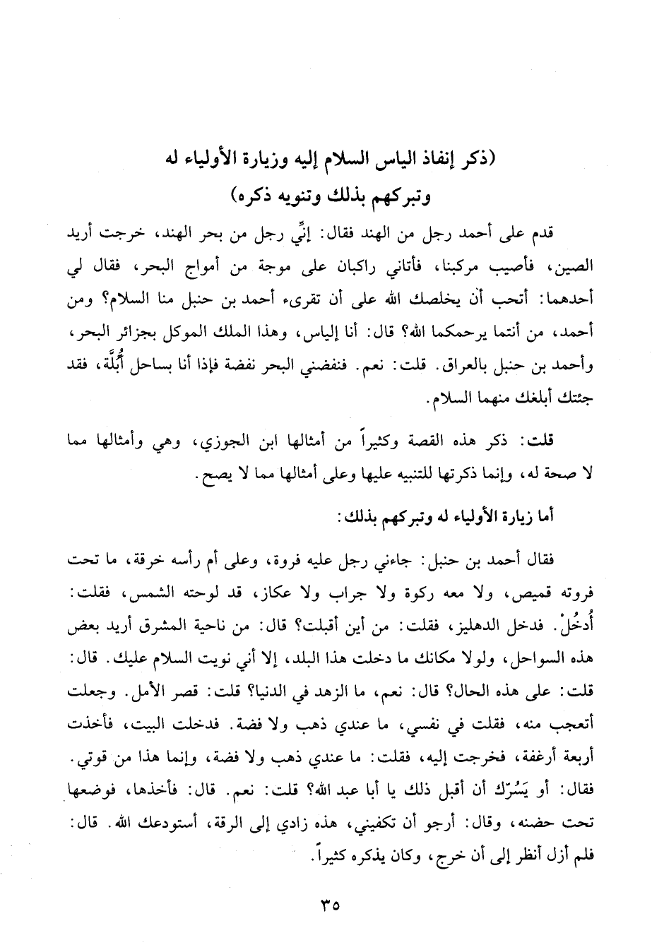 قدم على أحمد رجل من الهند فقال: إنَّي رجل من بحر الهند، خرجت أريد الصين، فأصيب مركبنا، فأتاني راكبان على موجة من أمواج البحر، فقال لي أحدهما: أتحب أن يخلصك الله على أن تقرئ أحمد بن حنبل منا السلام؟ ومن أحمد، من أنتما يرحمكما الله؟ قال: أنا إلياس، وهذا الملك الموكل بجزائر البحر، وأحمد بن حنبل بالعراق. قلت: نعم. فنفضني البحر نفضة فإذا أنا بساحل أُبُلَّة، فقد جئتك أبلغك منهما السلام.