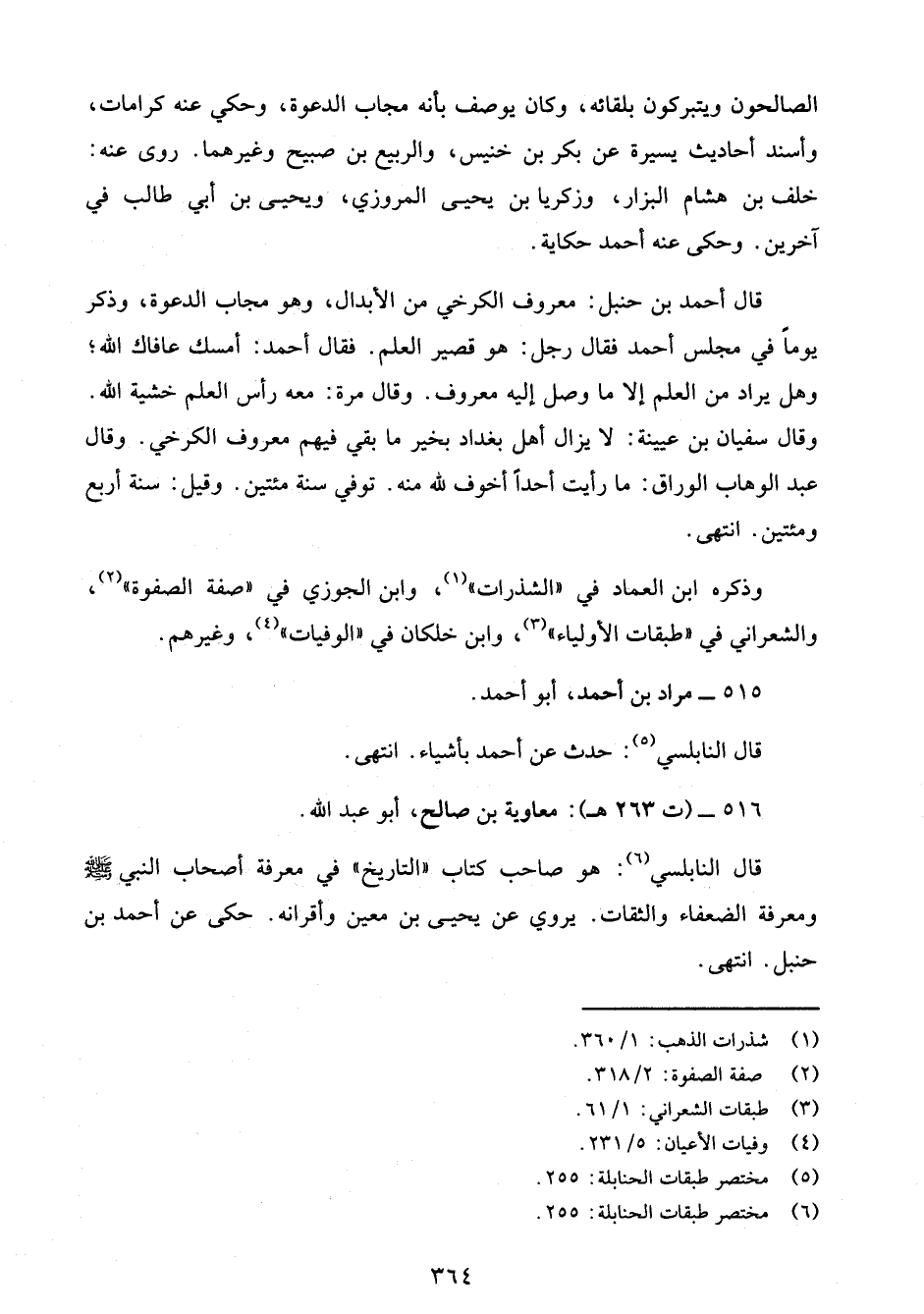 قال أحمد بن حنبل: معروف الكرخي من الأبدال، وهو مجاب الدعوة، وذكر يومًا في مجلس أحمد فقال رجل: هو قصير العلم. فقال أحمد: أمسك عافاك الله؛ وهل يراد من العلم إلا ما وصل إليه معروف. وقال مرة: معه رأس العلم خشية الله. وقال سفيان بن عيينة: لا يزال أهل بغداد بخير ما بقي فيهم معروف الكرخي. وقال عبد الوهاب الوراق: ما رأيت أحدًا أخوف لله منه. توفي سنة مئتين. وقيل: سنة أربع ومئتين. انتهى.