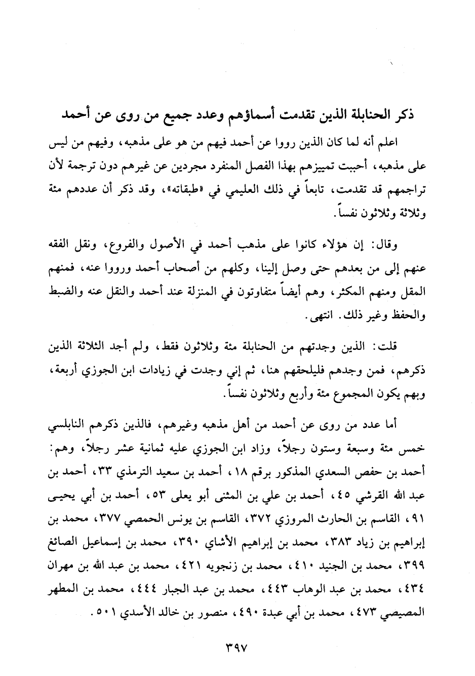 اعلم أنه لما كان الذين رووا عن أحمد فيهم من هو على مذهبه، وفيهم من ليس على مذهبه، أحببت تمييزهم بهذا الفصل المنفرد مجردين عن غيرهم دون ترجمة لأن تراجمهم قد تقدمت، تابعًا في ذلك العليمي في "طبقاته"، وقد ذكر أن عددهم مئة وثلاثة وثلاثون نفسًا.