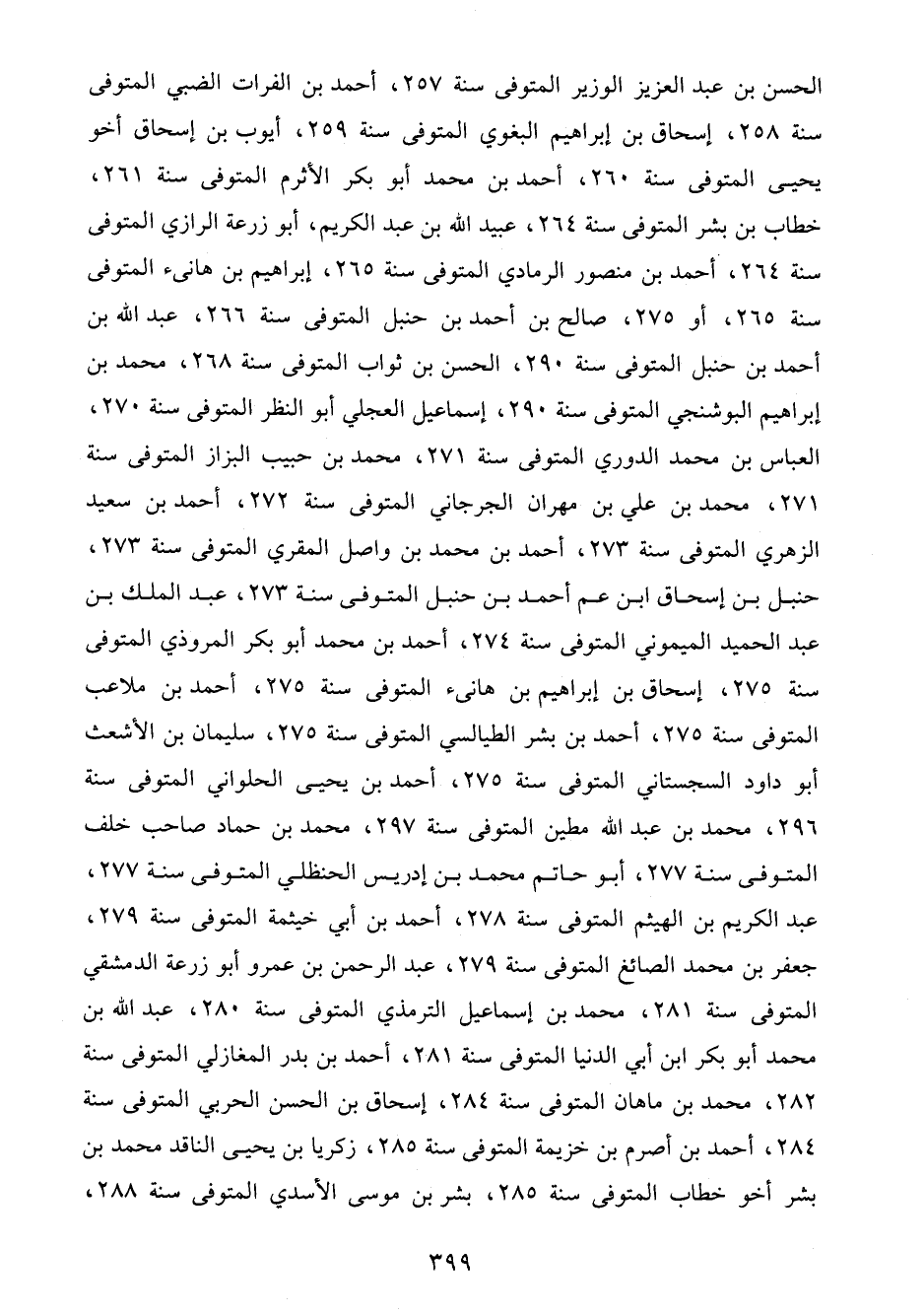 الحسن بن عبد العزيز الوزير المتوفى سنة 257، أحمد بن الفرات الضبي المتوفى سنة 258، إسحاق بن إبراهيم البغوي المتوفى سنة 259، أيوب بن إسحاق أخو يحيى المتوفى سنة 260، أحمد بن محمد أبو بكر الأثرم المتوفى سنة 261، خطاب بن بشر المتوفى سنة 264، عبيد الله بن عبد الكريم، أبو زرعة الرازي المتوفى سنة 264، أحمد بن منصور الرمادي المتوفى سنة 265، إبراهيم بن هانئ المتوفى سنة 265، أو 275، صالح بن أحمد بن حنبل المتوفى سنة 266، عبد الله بن أحمد بن حنبل المتوفى سنة 290، الحسن بن ثواب المتوفى سنة 268، محمد بن إبراهيم البوشنجي المتوفى سنة 290، إسماعيل العجلي أبو النظر المتوفى سنة 270، العباس بن محمد الدوري المتوفى سنة 271، محمد بن حبيب البزاز المتوفى سنة 271، محمد بن علي بن مهران الجرجاني المتوفى سنة 272، أحمد بن سعيد الزهري المتوفى سنة 273، أحمد بن محمد بن واصل المقري المتوفى سنة 273، حنبل بن إسحاق ابن عم أحمد بن حنبل المتوفى سنة 273، عبد الملك بن عبد الحميد الميموني المتوفى سنة 274، أحمد بن محمد أبو بكر المروذي المتوفى سنة 275، إسحاق بن إبراهيم بن هانئ المتوفى سنة 275، أحمد بن ملاعب المتوفى سنة 275، أحمد بن بشر الطيالسي المتوفى سنة 275، سليمان بن الأشعث أبو داود السجستاني المتوفى سنة 275، أحمد بن يحيى الحلواني المتوفى سنة 296، محمد بن عبد الله مطين المتوفى سنة 297، محمد بن حماد صاحب خلف المتوفى سنة 277، أبو حاتم محمد بن إدريس الحنظلي المتوفى سنة 277، عبد الكريم بن الهيثم المتوفى سنة 278، أحمد بن أبي خيثمة المتوفى سنة 279، جعفر بن محمد الصائغ المتوفى سنة 279، عبد الرحمن بن عمرو أبو زرعة الدمشقي المتوفى سنة 281، محمد بن إسماعيل الترمذي المتوفى سنة 280، عبد الله بن محمد أبو بكر ابن أبي الدنيا المتوفى سنة 281، أحمد بن بدر المغازلي المتوفى سنة 282، محمد بن ماهان المتوفى سنة 284، إسحاق بن الحسن الحربي المتوفى سنة 284، أحمد بن أصرم بن خزيمة المتوفى سنة 285، زكريا بن يحيى الناقد محمد بن بشر أخو خطاب المتوفى سنة 285، بشر بن موسى الأسدي المتوفى سنة 288،