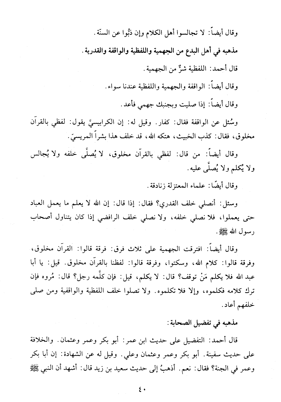وقال أيضًا: افترقت الجهمية على ثلاث فرق: فرقة قالوا: القرآن مخلوق، وفرقة قالوا: كلام الله، وسكتوا، وفرقة قالوا: لفظنا بالقرآن مخلوق. قيل: يا أبا عبد الله فلا يكلم مَنْ توقف؟ قال: لا يكلم، قيل: فإن كلَّمه رجل؟ قال: مُروه فإن ترك كلامه فكلموه، وإلا فلا تكلموه. ولا تصلوا خلف اللفظية والواقفية ومن صلى خلفهم أعاد.