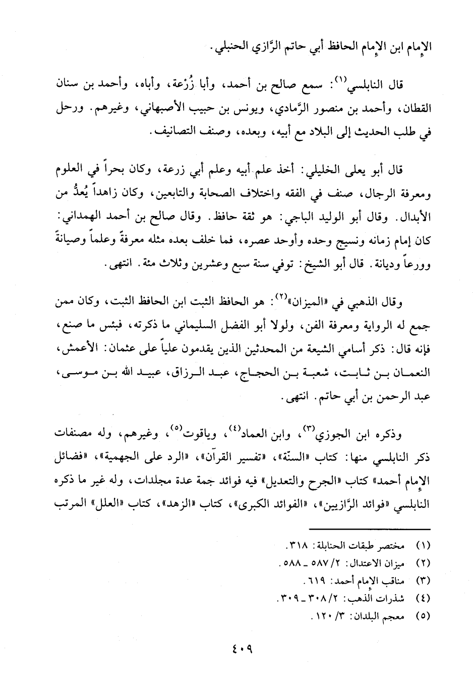 وذكره ابن الجوزي (¬3)، وابن العماد (¬4)، وياقوت (¬5)، وغيرهم، وله مصنفات ذكر النابلسي منها: كتاب "السنّة"، "تفسير القرآن"، "الرد على الجهمية"، "فضائل الإِمام أحمد" كتاب "الجرح والتعديل" فيه فوائد جمة عدة مجلدات، وله غير ما ذكره النابلسي "فوائد الرَّازيين"، "الفوائد الكبرى"، كتاب "الزهد"، كتاب "العلل" المرتب