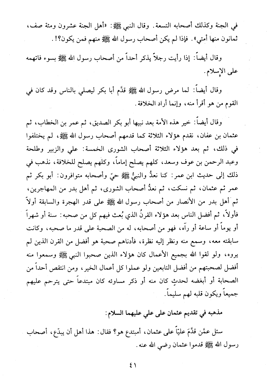 وقال أيضًا: خير هذه الأمة بعد نبيها أبو بكر الصديق، ثم عمر بن الخطاب، ثم عثمان بن عفان، نقدم هؤلاء الثلاثة كما قدمهم أصحاب رسول الله - صلى الله عليه وسلم -، لم يختلفوا في ذلك، ثم بعد هؤلاء الثلاثة أصحاب الشورى الخمسة: علي والزبير وطلحة وعبد الرحمن بن عوف وسعد، كلهم يصلح إمامًا، وكلهم يصلح للخلافة، نذهب في ذلك إلى حديث ابن عمر: كنا نعدُّ والنبيُّ - صلى الله عليه وسلم - حيّ وأصحابه متوافرون: أبو بكر ثم عمر ثم عثمان، ثم نسكت، ثم نعدُّ أصحاب الشورى، ثم أهل بدر من المهاجرين، ثم أهل بدر من الأنصار من أصحاب رسول الله - صلى الله عليه وسلم - على قدر الهجرة والسابقة أولًا فأولًا، ثم أفضل الناس بعد هؤلاء القرنُ الذي بُعث فيهم كل من صحبه: سنة أو شهرًا أو يومًا أو ساعة أو رآه، فهو من أصحابه، له من الصحبة على قدر ما صحبه، وكانت سابقته معه، وسمع منه ونظر إليه نظرة، فأدناهم صحبة هو أفضل من القرن الذين لم يروه، ولو لقوا الله بجميع الأعمال كان هؤلاء الذين صحبوا النبي - صلى الله عليه وسلم - وسمعوا منه أفضل لصحبتهم من أفضل التابعين ولو عملوا كل أعمال الخير، ومن انتقص أحدًا من الصحابة أو أبغضه لحدثٍ كان منه أو ذكر مساوئه كان مبتدعًا حتى يترحم عليهم جميعًا ويكون قلبه لهم سليمًا.