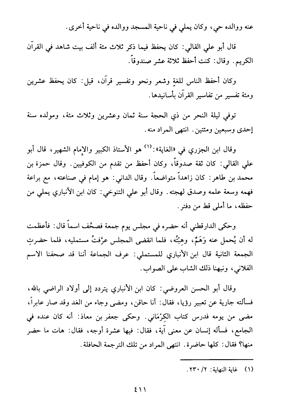 وقال ابن الجزري في "الغاية": (¬1) هو الأستاذ الكبير والإِمام الشهير، قال أبو علي القالي: كان ثقة صدوقًا، وكان أحفظ من تقدم من الكوفيين. وقال حمزة بن محمد بن طاهر: كان زاهدًا متواضعًا. وقال الداني: هو إمام في صناعته، مع براعة فهمه وسعة علمه وصدق لهجته. وقال أبو علي التنوخي: كان ابن الأنباري يملي من حفظه، ما أملى قط من دفتر.