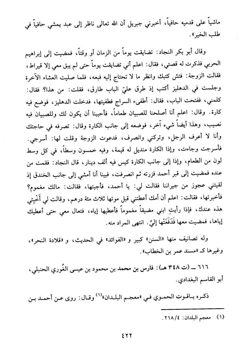 وقال أبو بكر النجاد: تضايقت يومًا من الزمان أو وقتًا، فمضيت إلى إبراهيم الحربي فذكرت له قصتي، فقال: اعلم أني تضايقت يومًا حتى لم يبق معي إلا قيراط، فقالت الزوجة: فتش كتبك وانظر ما لا تحتاج إليه فبعه، فلما صليت العشاء الآخرة وجلست في الدهليز أكتب إذ طرق عليّ الباب طارق، فقلت: من هذا؟ فقال: كلمني، ففتحت الباب، فقال: أطفئ السراج فطفيتها، فدخلت الدهليز، فوضع فيه كارة. وقال: اعلم أنا أصلحنا للصبيان طعامًا، فأحببنا أن يكون لك وللصبيان فيه نصيب، وهذا أيضًا شيء آخر، فوضعه إلى جانب الكارة وقال: تصرفه في حاجتك وأنا لا أعرف الرجل، وتركني وانصرف، فدعوت الزوجة وقلت لها: أسرجي. فأسرجت وجاءت، وإذا الكارة منديل له قيمة، وفيه خمسون وسطًا، في كل وسط لون من الطعام، وإذا إلى جانب الكارة كيس فيه ألف دينار، قال النجاد: فقمت من عنده فمضيت إلى قبر أحمد فزرته ثم انصرفت، فبينا أنا أمشي إلى جانب الخندق إذ لقيتني عجوز من جيراننا فقالت لي: يا أحمد، فأجبتها، فقالت: مالك مغموم؟ فأخبرتها، فقالت: اعلم أن أمك أعطتني قبل موتها ثلاث مئة درهم، وقالت لي أَخْبِئي هذه عندك، فإذا رأيتِ ابني مضيقًا مغمومًا فأعطيها إياه، فتعال معي حتى أعطيك إياها، فمضيت معها فَدَفَعَتْها إليَّ. انتهى المراد منه.