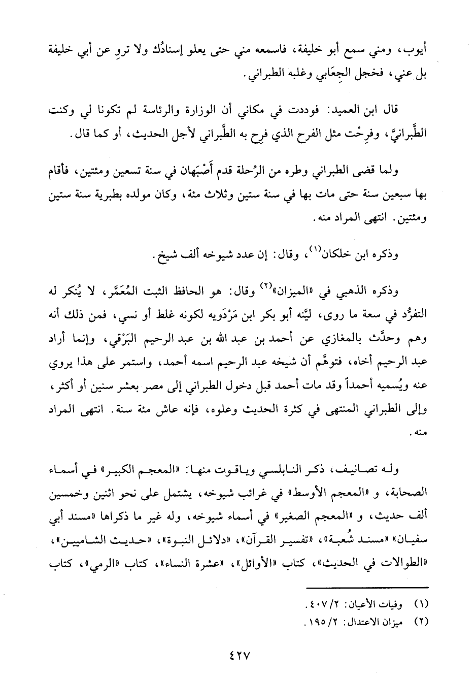 وذكره الذهبي في "الميزان" (¬2) وقال: هو الحافظ الثبت المُعَمَّر، لا يُنكر له التفرُّد في سعة ما روى، ليَّنه أبو بكر ابن مَرْدَويه لكونه غلط أو نسي، فمن ذلك أنه وهم وحدَّث بالمغازي عن أحمد بن عبد الله بن عبد الرحيم البَرْقي، وإنما أراد عبد الرحيم أخاه، فتوهَّم أن شيخه عبد الرحيم اسمه أحمد، واستمر على هذا يروي عنه ويُسميه أحمدًا وقد مات أحمد قبل دخول الطبراني إلى مصر بعشر سنين أو أكثر، وإلى الطبراني المنتهى في كثرة الحديث وعلوه، فإنه عاش مئة سنة. انتهى المراد منه.