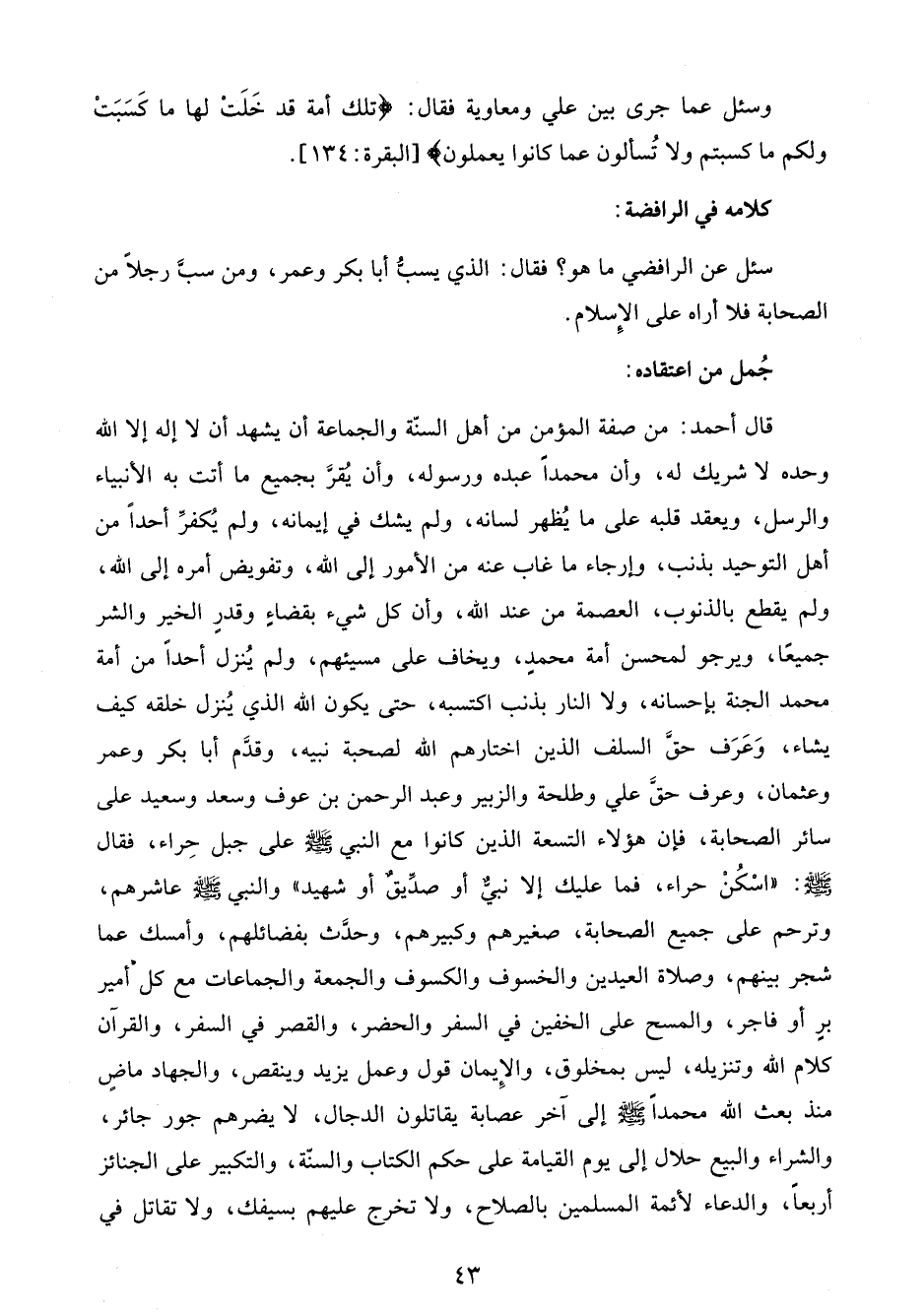 قال أحمد: من صفة المؤمن من أهل السنّة والجماعة أن يشهد أن لا إله إلا الله وحده لا شريك له، وأن محمدًا عبده ورسوله، وأن يُقرَّ بجميع ما أتت به الأنبياء والرسل، ويعقد قلبه على ما يُظهر لسانه، ولم يشك في إيمانه، ولم يُكفرِّ أحدًا من أهل التوحيد بذنب، وإرجاء ما غاب عنه من الأمور إلى الله، وتفويض أمره إلى الله، ولم يقطع بالذنوب، العصمة من عند الله، وأن كل شيء بقضاءٍ وقدرٍ الخير والشر جميعًا، ويرجو لمحسن أمة محمدٍ، ويخاف على مسيئهم، ولم يُنزل أحدًا من أمة محمد الجنة بإحسانه، ولا النار بذنب اكتسبه، حتى يكون الله الذي يُنزل خلقه كيف يشاء، وَعَرَف حقَّ السلف الذين اختارهم الله لصحبة نبيه، وقدَّم أبا بكر وعمر وعثمان، وعرف حقَّ علي وطلحة والزبير وعبد الرحمن بن عوف وسعد وسعيد على سائر الصحابة، فإن هؤلاء التسعة الذين كانوا مع النبي - صلى الله عليه وسلم - على جبل حِراء، فقال - صلى الله عليه وسلم -: "اسْكُنْ حراء، فما عليك إلا نبيٌّ أو صدِّيقٌ أو شهيد" والنبي - صلى الله عليه وسلم - عاشرهم، وترحم على جميع الصحابة، صغيرهم وكبيرهم، وحدَّث بفضائلهم، وأمسك عما شجر بينهم، وصلاة العيدين والخسوف والكسوف والجمعة والجماعات مع كل أمير برٍ أو فاجر، والمسح على الخفين في السفر والحضر، والقصر في السفر، والقرآن كلام الله وتنزيله، ليس بمخلوق، والإِيمان قول وعمل يزيد وينقص، والجهاد ماضٍ منذ بعث الله محمدًا - صلى الله عليه وسلم - إلى آخر عصابة يقاتلون الدجال، لا يضرهم جور جائر، والشراء والبيع حلال إلى يوم القيامة على حكم الكتاب والسنّة، والتكبير على الجنائز أربعًا، والدعاء لأئمة المسلمين بالصلاح، ولا تخرج عليهم بسيفك، ولا تقاتل في