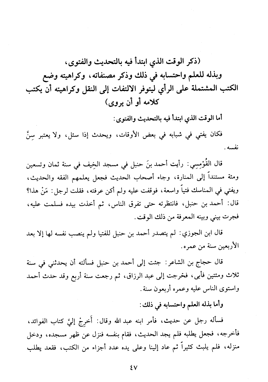 قال ابن الجوزي: لم يتصدر أحمد بن حنبل للفتيا ولم ينصب نفسه لها إلا بعد الأربعين سنة من عمره.