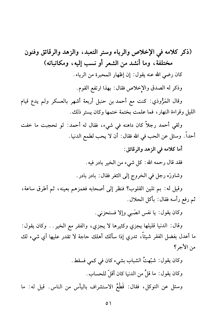 (ذكر كلامه في الإخلاص والرياء وستر التعبد، والزهد والرقائق وفنون مختلفة، وما أنشد من الشعر أو نسب إليه، ومكاتباته)