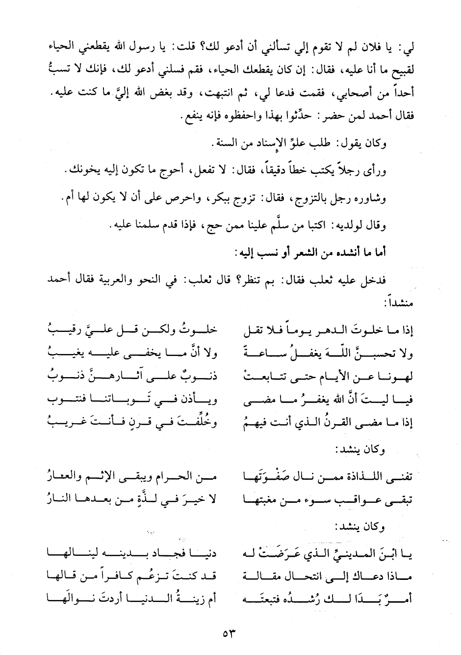 فدخل عليه ثعلب فقال: بم تنظر؟ قال ثعلب: في النحو والعربية فقال أحمد منشدًا: