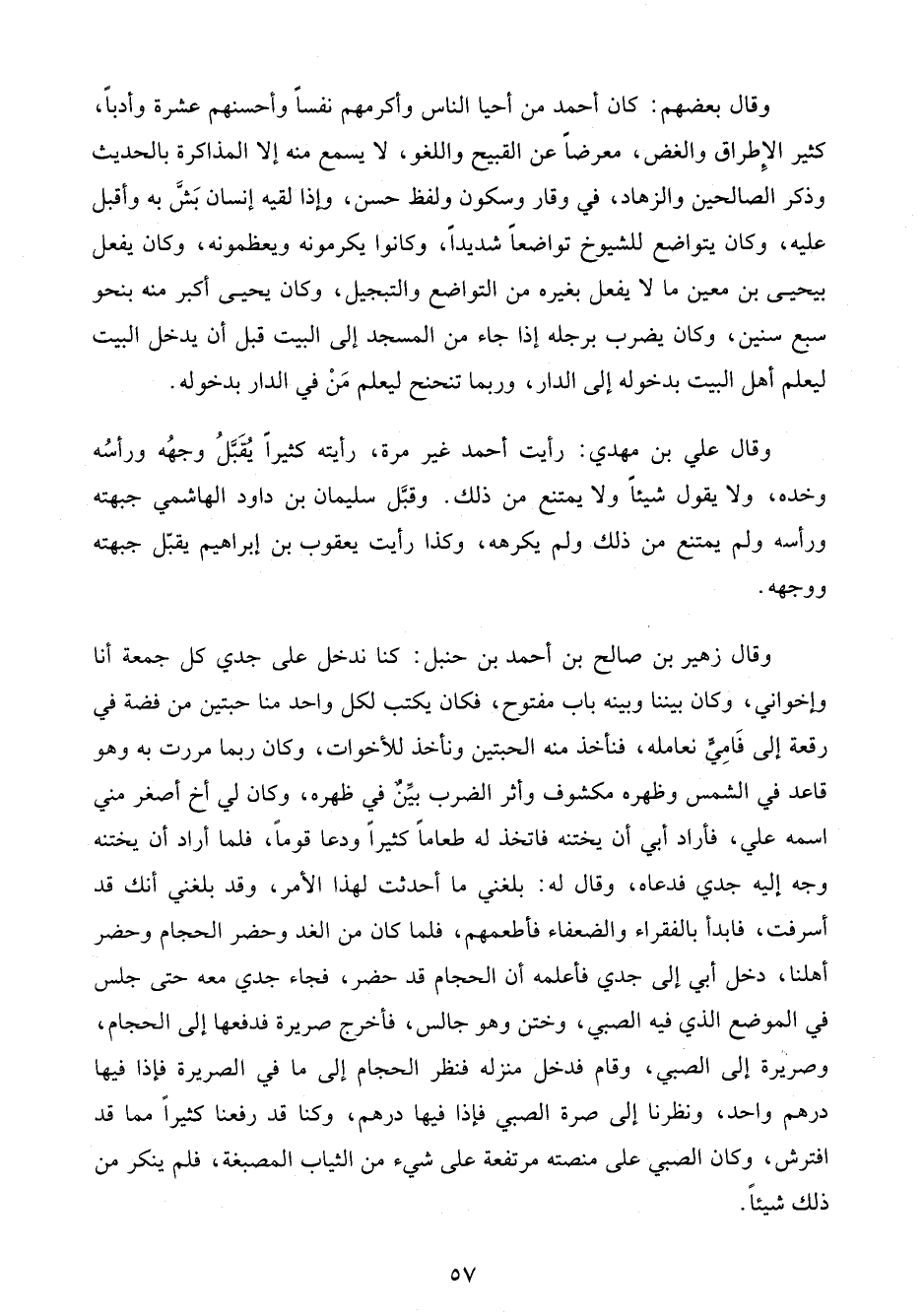 وقال علي بن مهدي: رأيت أحمد غير مرة، رأيته كثيرًا يمثلُ وجهُه ورأسُه وخده، ولا يقول شيئًا ولا يمتنع من ذلك. وقبَّل سليمان بن داود الهاشمي جبهته ورأسه ولم يمتنع من ذلك ولم يكرهه، وكذا رأيت يعقوب بن إبراهيم يقبّل جبهته ووجهه.