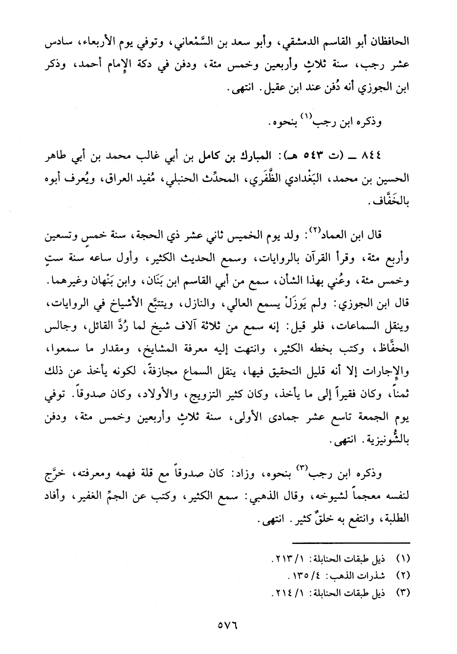 844 - (ت 543 هـ): المبارك بن كامل بن أبي غالب محمد بن أبي طاهر الحسين بن محمد، البَغْدادي الظَّفَري، المحدِّث الحنبلي، مُفيد العراق، ويُعرف أبوه بالخَفَّاف.