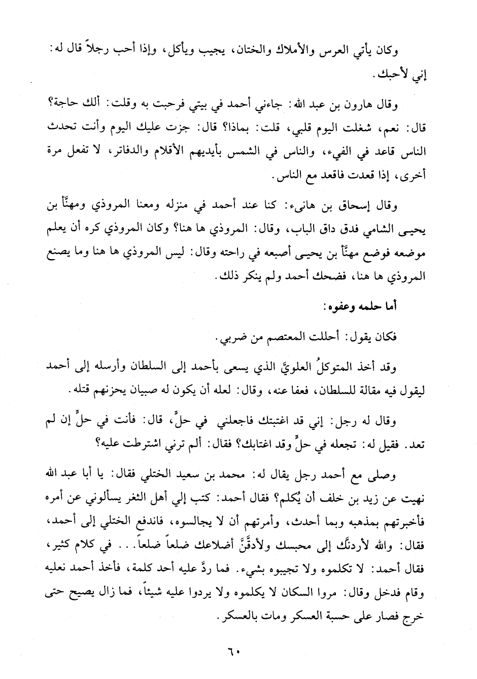 وقد أخذ المتوكلُ العلويَّ الذي يسعى بأحمد إلى السلطان وأرسله إلى أحمد ليقول فيه مقالة للسلطان، فعفا عنه، وقال: لعله أن يكون له صبيان يحزنهم قتله.