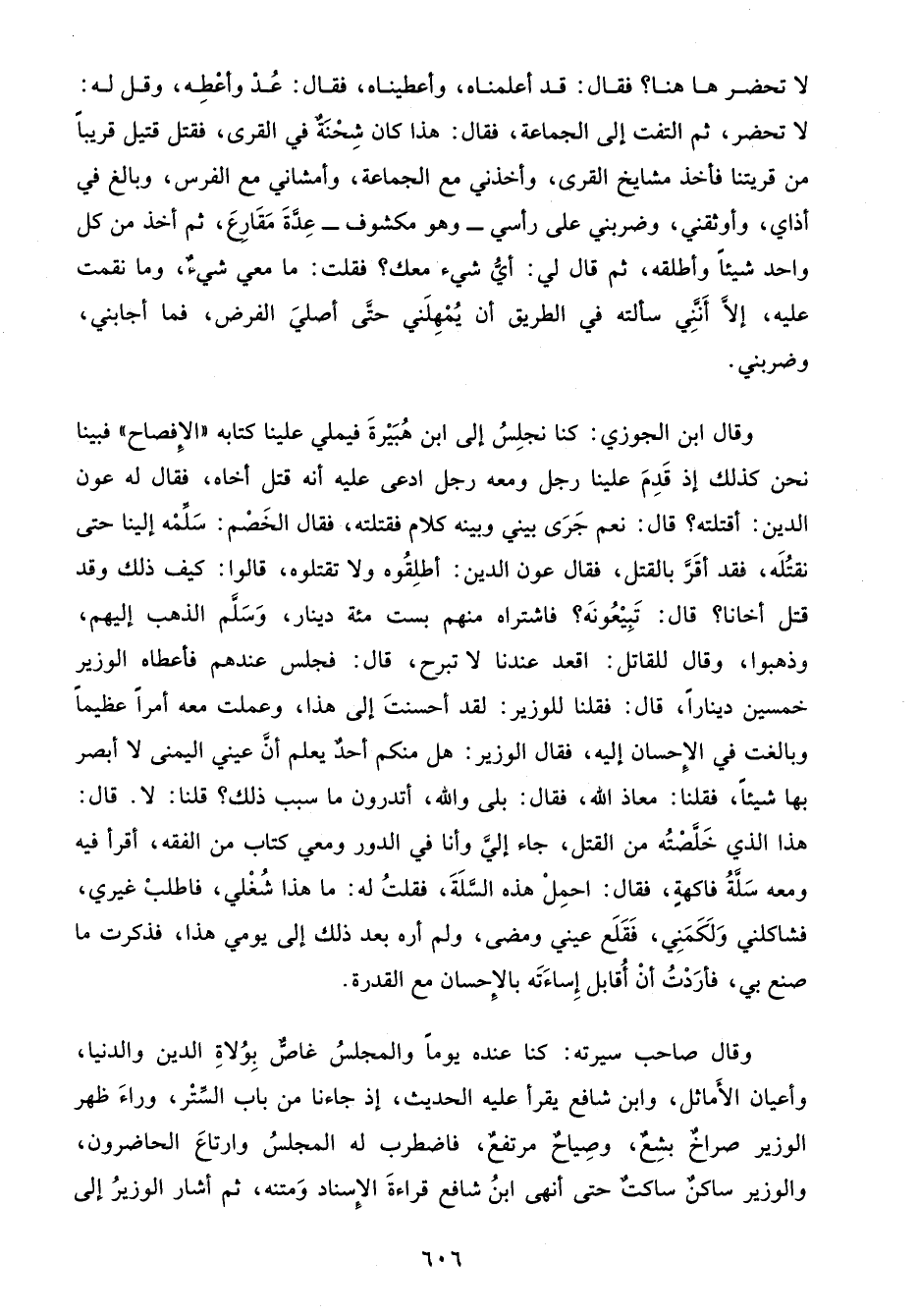 لا تحضر ها هنا؟ فقال: قد أعلمناه، وأعطيناه، فقال: عُدْ وأعْطِه، وقل له: لا تحضر، ثم التفت إلى الجماعة، فقال: هذا كان شِحْنَةٌ في القرى، فقتل قتيل قريبًا من قريتنا فأخذ مشايخ القرى، وأخذني مع الجماعة، وأمشاني مع الفرس، وبالغ في أذاي، وأوثقني، وضربني على رأسي - وهو مكشوف - عِدَّةَ مَقَارِعَ، ثم أخذ من كل واحد شيئًا وأطلقه، ثم قال لي: أيُّ شيء معك؟ فقلت: ما معي شيءٌ، وما نقمت عليه، إلَّا أَنَّنِي سألته في الطريق أن يُمْهِلَني حتَّى أصليَ الفرض، فما أجابني، وضربني.