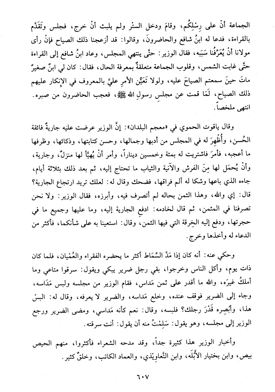 وقال ياقوت الحموي في "معجم البلدان": إنَّ الوزير عرضت عليه جاريةٌ فائقة الحُسن، وأُظْهِرَ له في المجلس من أدبها وجمالها، وحسن كتابتها، وذكائها، وظرفها ما أعجبه، فأمرَ فاشتريت له بمئة وخمسين دينارًا، وأمر أنْ يُهيَّأ لها منزلٌ، وجارية، وأنْ يُحمَل لها مِنَ الفرش والآنية والثياب ما تحتاج إليه، ثم بعد ذلك بثلاثة أيام، جاءه الذي باعها وشكا له ألم فراقها، فضحك وقال له: لعلك تريد ارتجاع الجارية؟ قال: إي والله، وهذا الثمن بحاله لم أتصرف فيه، وأبرزه، فقال الوزير: ولا نحن تصرفنا في المثمن، ثم قال لخادمه: ادفعِ الجارية إليه، وما عليها وجميع ما في حجرتها، ودفع إليه الخِرقة التي فيها الثمن، وقال: استعينا به على شأنكما، فأكثر من الدعاء له وأخذها وخرج.