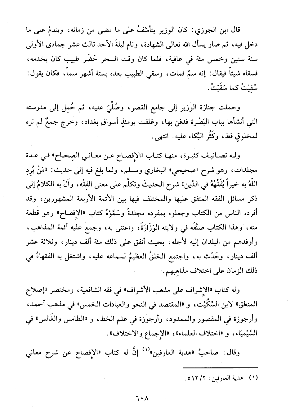 وله تصانيف كثيرة، منها كتاب "الإِفصاح عن معاني الصِحاح" في عدة مجلدات، وهو شرح "صحيحي" البخاري ومسلم، ولما بلغ فيه إلى حديث: "مَنْ يُرِدِ اللهُ به خيرًا يُفَقَّهْهُ في الدِّين" شرح الحديثَ وتكلَّم على معنى الفِقْه، وآلَ به الكلامُ إلى ذكر مسائل الفقه المتفق عليها والمختلف فيها بين الأئمة الأربعة المشهورين، وقد أفرده الناس من الكتاب وجعلوه بمفرده مجلدةً وسَمَّوْهُ كتاب "الإِفصاح" وهو قطعة منه، وهذا الكتاب صنَّفَه في ولايته الوَزَارَةَ، واعتنى به، وجمع عليه أئمة المذاهب، وأوفدهم من البلدان إليه لأجله، بحيث أنفق على ذلك مئة ألف دينار، وثلاثة عشر ألف دينار، وحَدّث به، واجتمع الخلقُ العظيمُ لسماعه عليه، واشتغل به الفقهاءُ في ذلك الزمان على اختلاف مذاهِبهم.