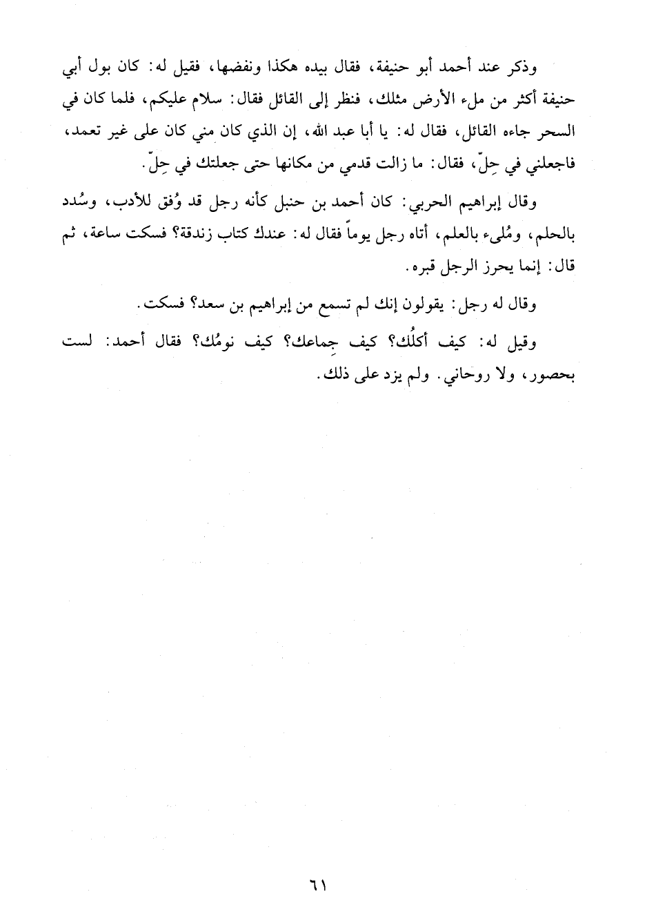 وقيل له: كيف أكلُك؟ كيف جِماعك؟ كيف نومُك؟ فقال أحمد: لست بحصور، ولا روحاني. ولم يزد على ذلك.
