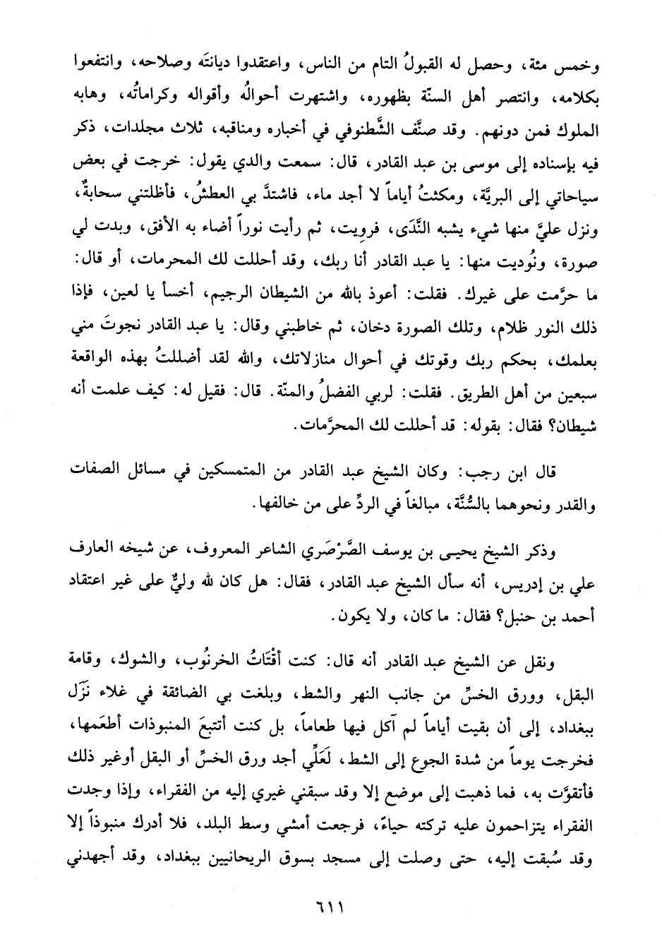 وخمس مئة، وحصل له القبولُ التام من الناس، واعتقدوا ديانتَه وصلاحه، وانتفعوا بكلامه، وانتصر أهل السنّة بظهوره، واشتهرت أحوالُه وأقواله وكراماتُه، وهابه الملوك فمن دونهم. وقد صنَّف الشَّطنوفي في أخباره ومناقبه، ثلاث مجلدات، ذكر فيه بإسناده إلى موسى بن عبد القادر، قال: سمعت والدي يقول: خرجت في بعض سياحاتي إلى البريَّة، ومكثتُ أيامًا لا أجد ماء، فاشتدَّ بي العطشُ، فأظلتني سحابةٌ، ونزل عليَّ منها شيء يشبه النَّدَى، فروِيت، ثم رأيت نورًا أضاء به الأفق، وبدت لي صورة، ونُوديت منها: يا عبد القادر أنا ربك، وقد أحللت لك المحرمات، أو قال: ما حرَّمت على غيرك. فقلت: أعوذ بالله من الشيطان الرجيم، أخسأ يا لعين، فإذا ذلك النور ظلام، وتلك الصورة دخان، ثم خاطبني وقال: يا عبد القادر نجوتَ مني بعلمك، بحكم ربك وقوتك في أحوال منازلاتك، والله لقد أضللتُ بهذه الواقعة سبعين من أهل الطريق. فقلت: لربي الفضلُ والمنّة. قال: فقيل له: كيف علمت أنه شيطان؟ فقال: بقوله: قد أحللت لك المحرَّمات.
