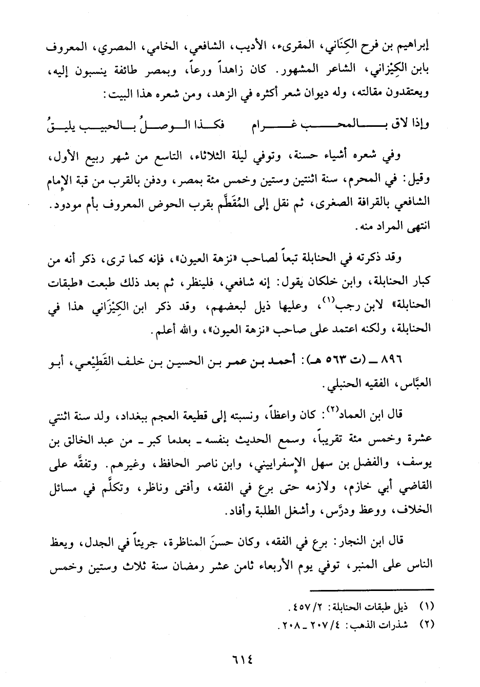 وقد ذكرته في الحنابلة تبعًا لصاحب "نزهة العيون"، فإنه كما ترى، ذكر أنه من كبار الحنابلة، وابن خلكان يقول: إنه شافعي، فلينظر، ثم بعد ذلك طبعت "طبقات الحنابلة" لابن رجب (¬1)، وعليها ذيل لبعضهم، وقد ذكر ابن الكِيْزَاني هذا في الحنابلة، ولكنه اعتمد على صاحب "نزهة العيون"، والله أعلم.