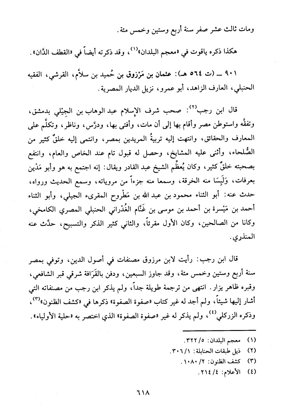 901 - (ت 564 هـ): عثمان بن مَرْزوق بن حُميد بن سلَّام، القرشي، الفقيه الحنبلي، العارف الزاهد، أبو عمرو، نزيل الديار المصرية.
