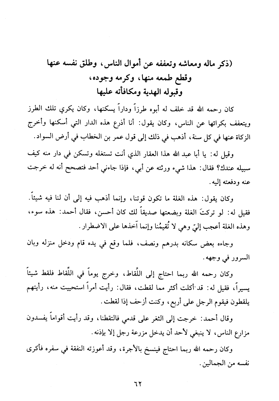 وكان يقول: هذه الغلة ما تكون قوتنا، وإنما أذهب فيه إلى أن لنا فيه شيئًا. فقيل له: لو تركتَ الغلة وبضعتها صديقًا لك كان أحسن، فقال أحمد: هذه سوء، وهذه الغلة أعجب إليّ وهي لا تُقيمُنا وإنما آخذها على الاضطرار.