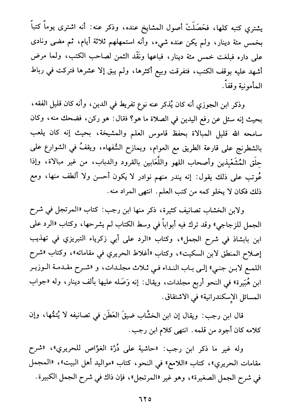 قال ابن رجب: ويقال إن ابن الخشَّاب ضيقَ العَطَن في تصانيفه لا يُتمُّها، وإن كلامه كان أجود من قلمه. انتهى كلام ابن رجب.