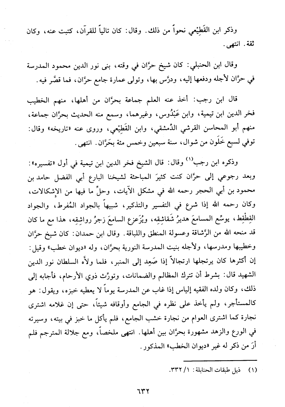 وذكره ابن رجب (¬1) وقال: قال الشيخ فخر الدين ابن تيمية في أول "تفسيره": وبعد رجوعي إلى حرَّان كنت كثيرَ المباحثة لشيخنا البارع أبي الفضل حامد بن محمود بن أبي الحجر رحمه الله في مشكل الآيات، وحلَّ ما فيها من الإِشكالات، وكان رحمه الله إذا شرع في التفسير والتذكير، شبيهًا بالجواد المُفرط، والجواد القِطْقِط، يوسَّع المسامعَ هديرُ شَقاشِقِه، ويُزَعزع السامعَ زجرُ رواشِقِه، هذا مع ما كان قد منحه الله من الرَّشاقة وعسولة المنطق واللباقة. وقال ابن حمدان: كان شيخ حرَّان وخطيبها ومدرسها، ولأجله بنيت المدرسة النورية بحرَّان، وله "ديوان خطب" وقيل: إن أكثرها كان يرتجلها ارتجالًا إذا صَعِد إلى المنبر، فلما ولَّاه السلطان نور الدين الشهيد قال: بشرط أن تترك المظالم والضمانات، وتورِّث ذوي الأرحام، فأجابه إلى ذلك، وكان ولده الفقيه إلياس إذا غاب عن المدرسة يومًا لا يعطيه خبزه، ويقول: هو كالمستأجر، ولم يأخذ على نظره في الجامع وأوقافه شيئًا، حتى إن غلامه اشترى نجارة كما اشترى العوام من نجارة خشب الجامع، فلم يأكل ما خبز في بيته، وسيرته في الورع والزهد مشهورة بحران بين أهلها. انتهى ملخصًا، ومع جلالة المترجم فلم أرَ من ذكر له غير "ديوان الخطب" المذكور.