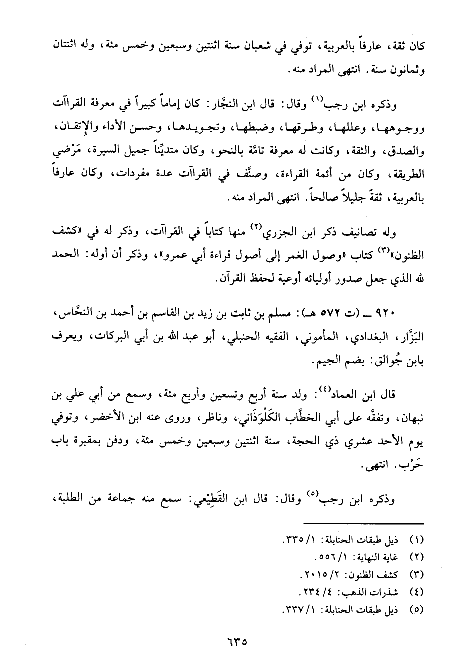 وذكره ابن رجب (¬1) وقال: قال ابن النجَّار: كان إمامًا كبيرًا في معرفة القراآت ووجوهها، وعللها، وطرقها، وضبطها، وتجويدها، وحسن الأداء والإِتقان، والصدق، والثقة، وكانت له معرفة تامَّة بالنحو، وكان متديَّنًا جميل السيرة، مَرْضي الطريقة، وكان من أئمة القراءة، وصنَّف في القراآت عدة مفردات، وكان عارفًا بالعربية، ثقةً جليلًا صالحًا. انتهى المراد منه.